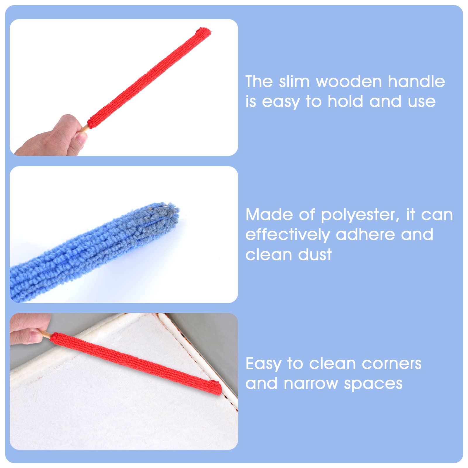 Comodo manico lungo, può aiutare a raggiungere gli spazi stretti e difficili, afferrare la polvere negli angoli: puoi pulire spazi stretti, ai posti che non possono raggiungere, ideali per tende, auto, soffitti, prese d’aria, ecc.