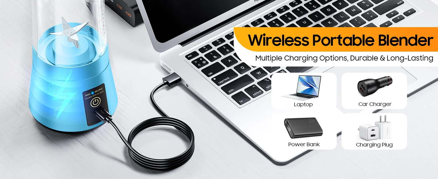 3.Ricarica rapida USB e display intelligente:Ricarica rapidamente e comodamente tramite USB (cavo di ricarica incluso).Il chiaro display del livello della batteria ti tiene sempre informato, assicurandoti che il tuo frullatore a batteria sia pronto per la miscela successiva: non dovrai più aspettare.