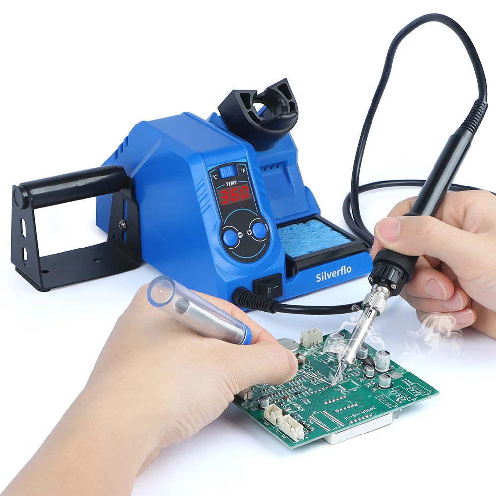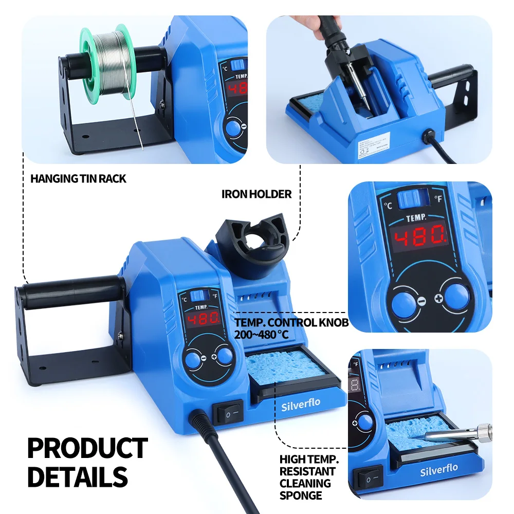 3. Design compatto e funzioni versatili.Tutte le funzioni sono integrate nell’unità compatta: controllo della temperatura nella parte anteriore, supporto per saldatore nella parte superiore, spugna per la pulizia sul fondo e supporto per filo per saldatura sul lato, il design integrato consente di risparmiare spazio