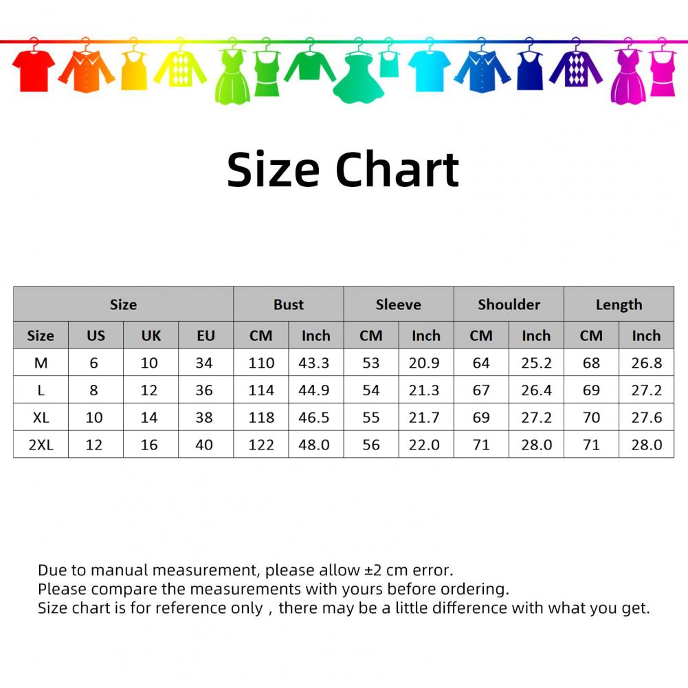 Taglia: 2XL, busto: 122cm/48.03 “, lunghezza vestiti: 71cm/27.95”, manica: 56cm/22.05 “, spalla: 71cm/27.95” (circa)