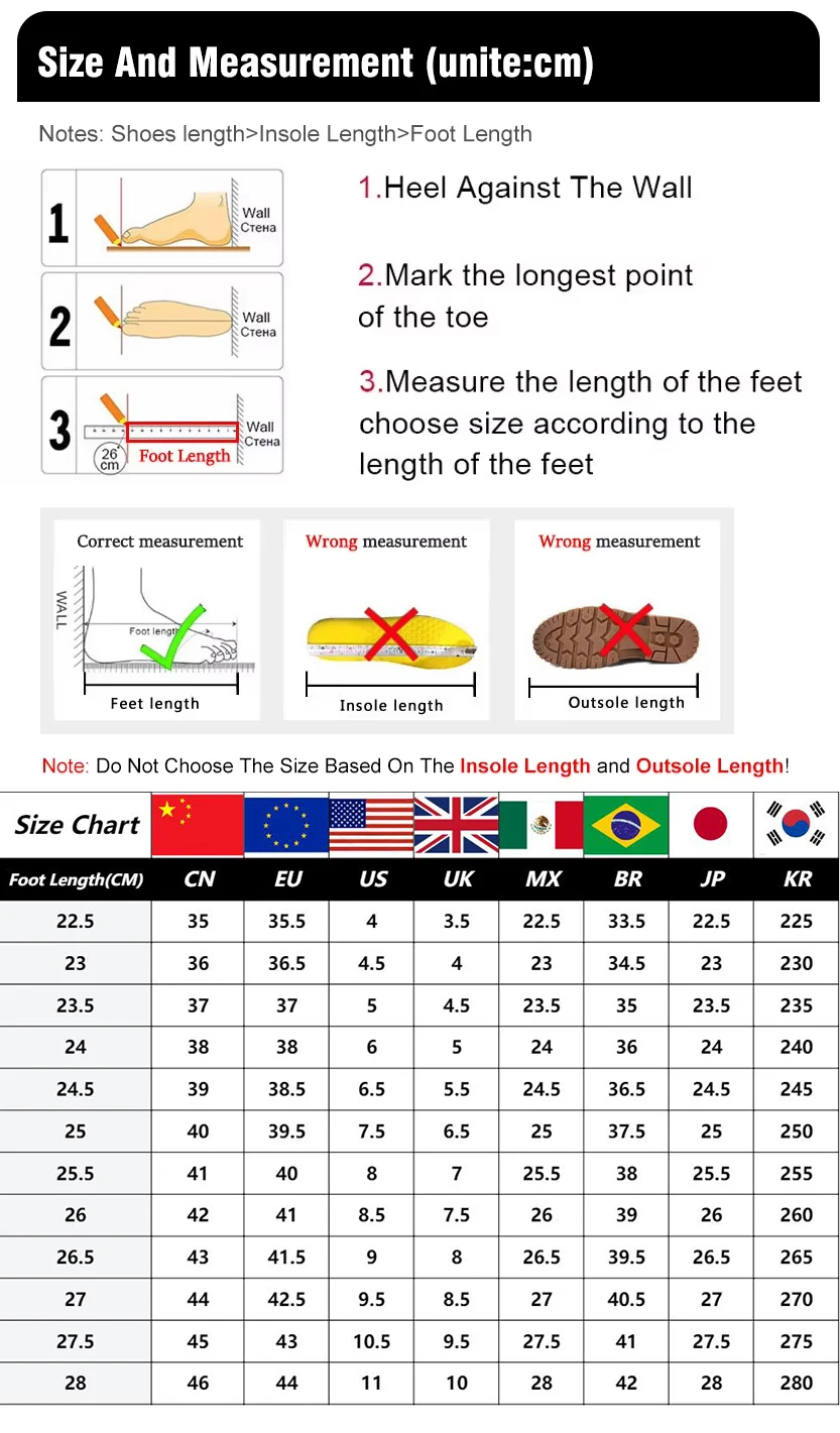 1.Le scarpe NON sono standard di taglia EUR/USA.La lunghezza del piede è la SOLO standard per la dimensione.Si prega di misurare la lunghezza del piede con precisione.La lunghezza della sottopiede dovrebbe essere di 0-1,5 cm più lunga che il piede.