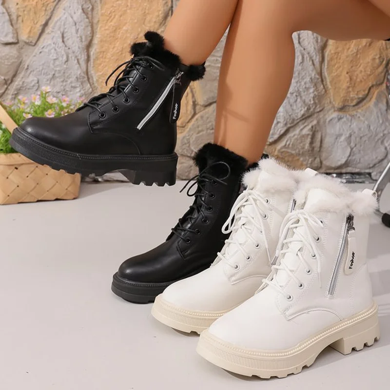 Stivaletti corti in peluche autunno inverno moda donna cerniera stivali da moto in pelle PU nera donna piattaforma stringata Botas Mujer