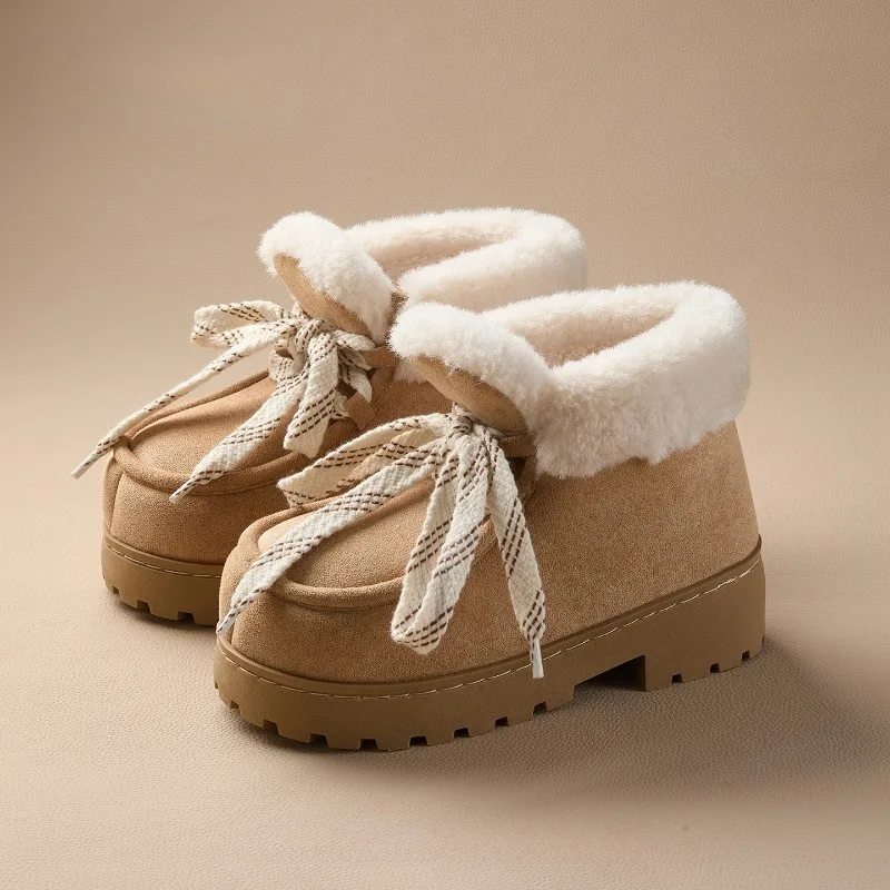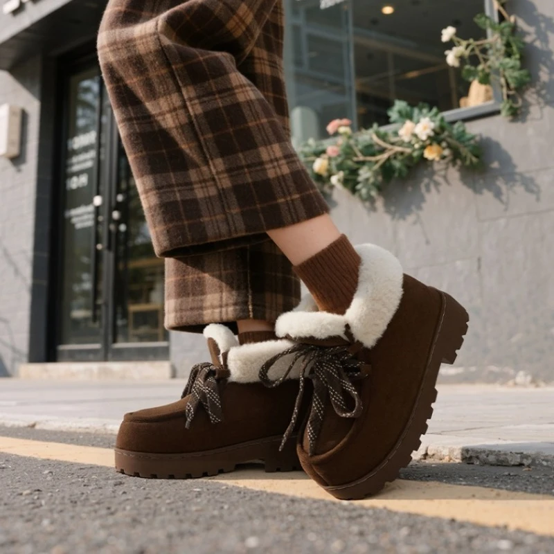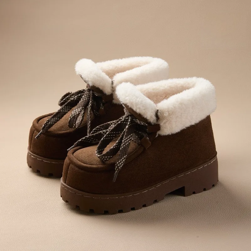 Stivaletti invernali caldi e soffici con lacci per donna Stivali con plateau in pelle scamosciata sintetica marrone retrò Comfort Stivali da neve con tacco grosso antiscivolo