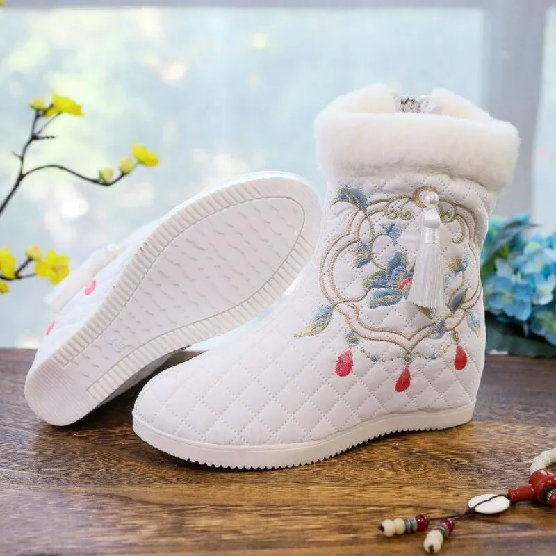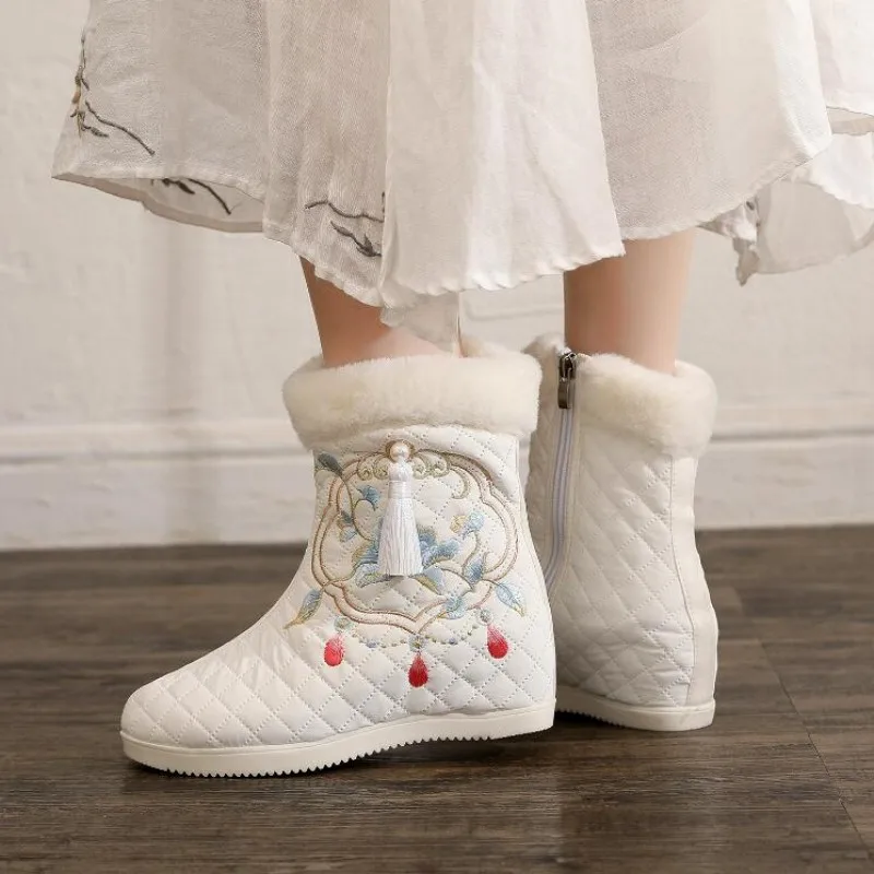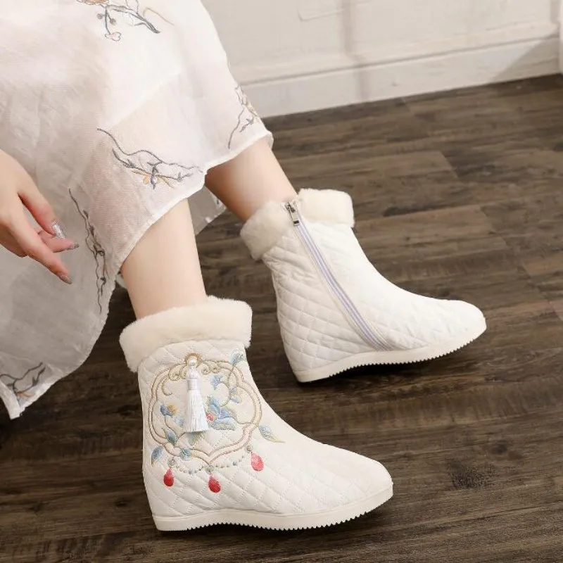 Stivaletti invernali ricamati da donna con bordi in pelliccia Zip laterale Stivaletti corti in peluche Dettaglio con frange Scarpe calde che aumentano l'altezza 1Stivaletti invernali ricamati da donna con bordi in pelliccia Zip laterale Stivaletti corti in peluche Dettaglio con frange Scarpe calde che aumentano l’altezza