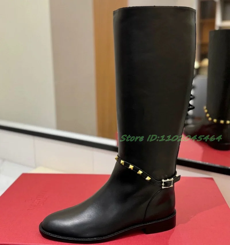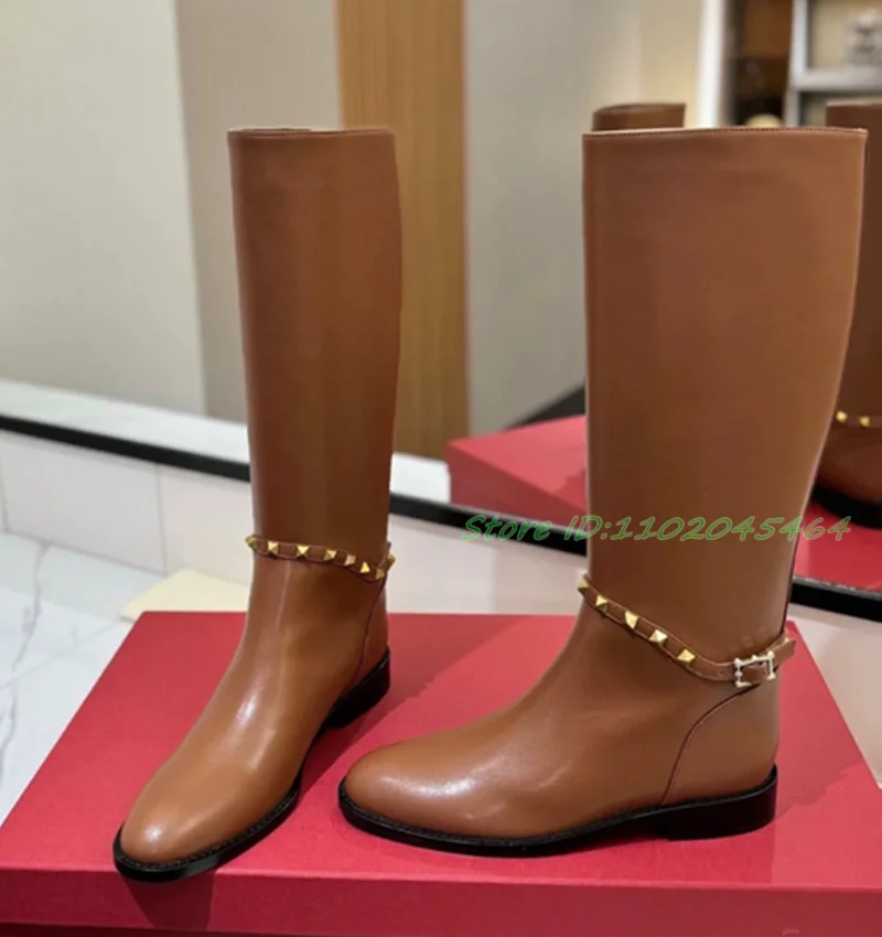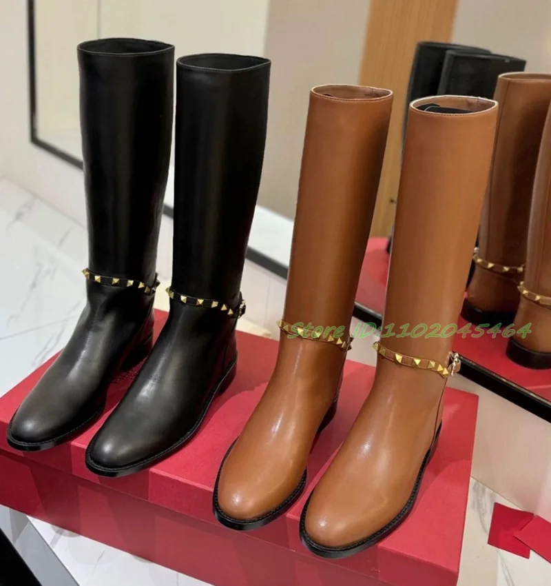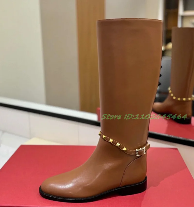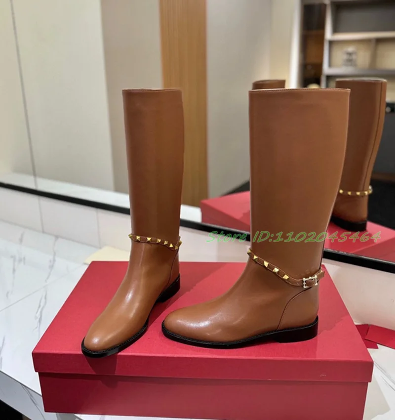 Stivali alti al ginocchio in pelle piatta Rockstud neri marroni Punta tonda da donna morbida 2024 Inverno Pull on Long Boot Scarpe firmate di lusso