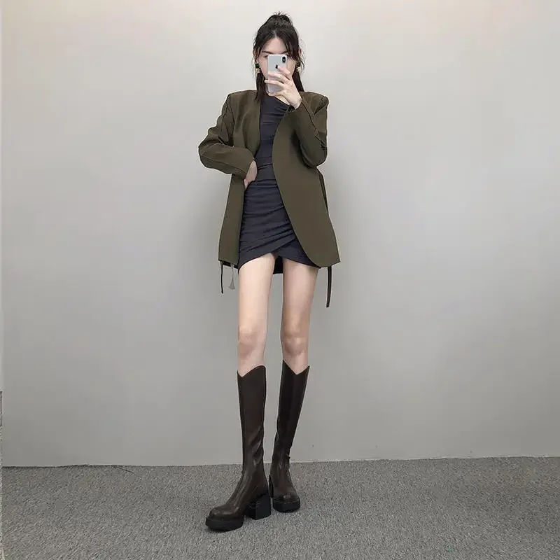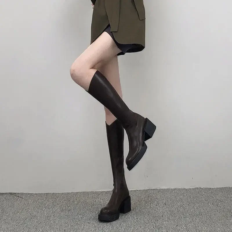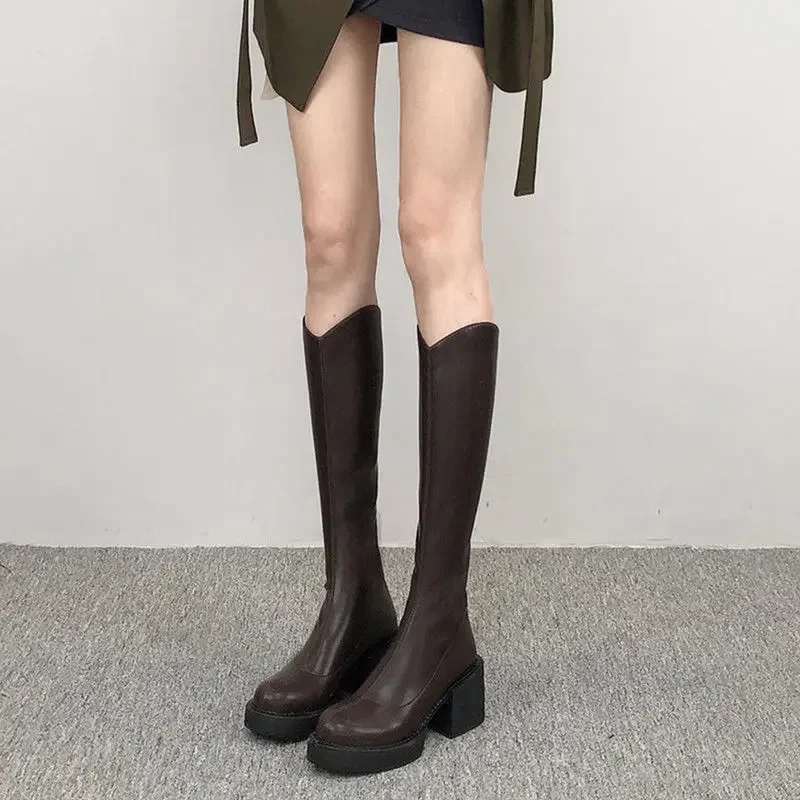 Stivali alti sopra il ginocchio con tacco spesso marrone Stivali da donna con punta tonda con fondo in gomma alla moda stile cavaliere sottile primavera autunno 1Stivali alti sopra il ginocchio con tacco spesso marrone Stivali da donna con punta tonda con fondo in gomma alla moda stile cavaliere sottile primavera autunno
