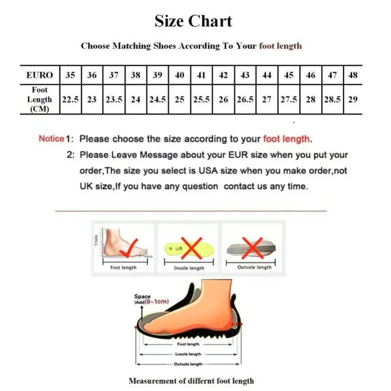 Per la dimensione Scegli la taglia in base alla lunghezza del piede (dal tallone alla punta)! Materiali diversi per paesi diversi hanno standard di dimensione diversi. Quindi la nostra taglia USA e la taglia Europa potrebbero essere diverse dalle tue. Si prega di misurare prima la lunghezza del piede e poi scegliere la taglia corrispondente. Il numero della taglia indicato sulla suola della scarpa è il numero della taglia cinese, non quella europea. Informazioni sull’aberrazione cromatica A causa del diverso contrasto dei monitor personali, potrebbe esserci una leggera differenza di colore tra l’immagine e il prodotto reale. Informazioni sull’odore Le scarpe nuove appena uscite dalla fabbrica possono odorare di colla, ma non è un problema di qualità. Spero che possa essere compreso. L’odore si dissiperà dopo essere stato collocato in un luogo ventilato per un periodo di tempo.