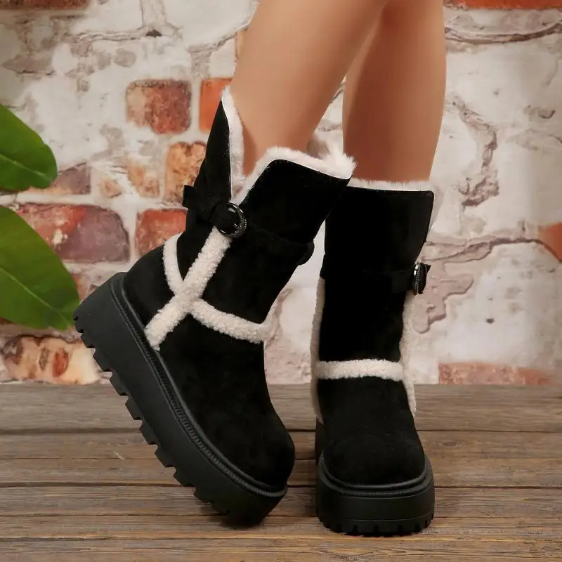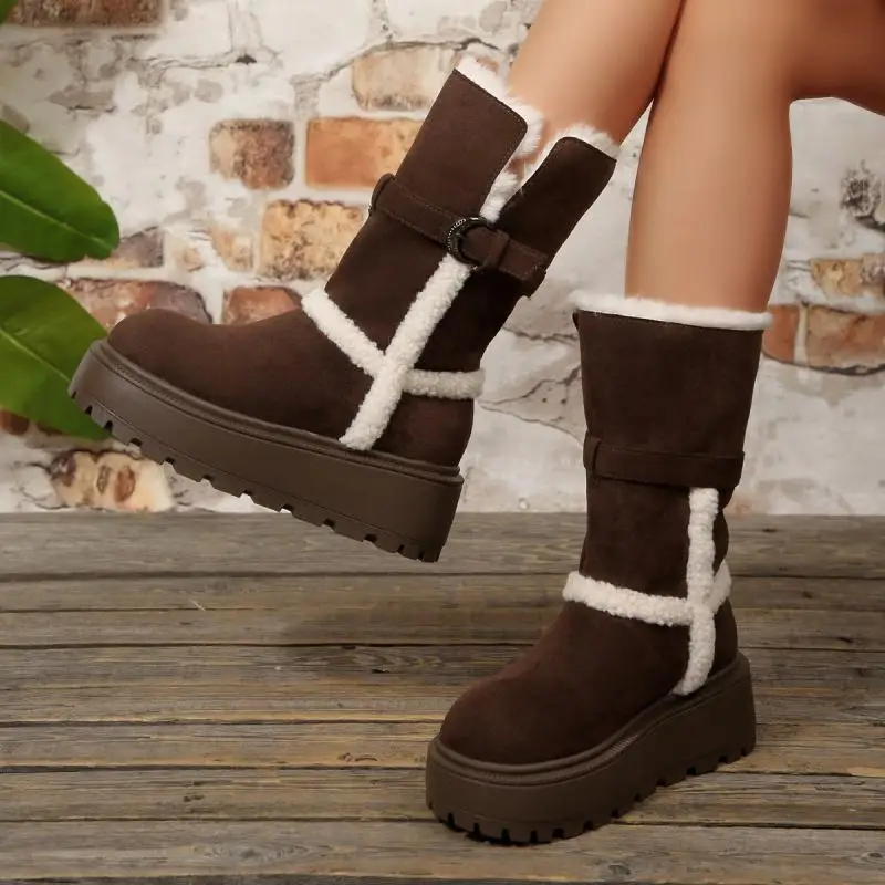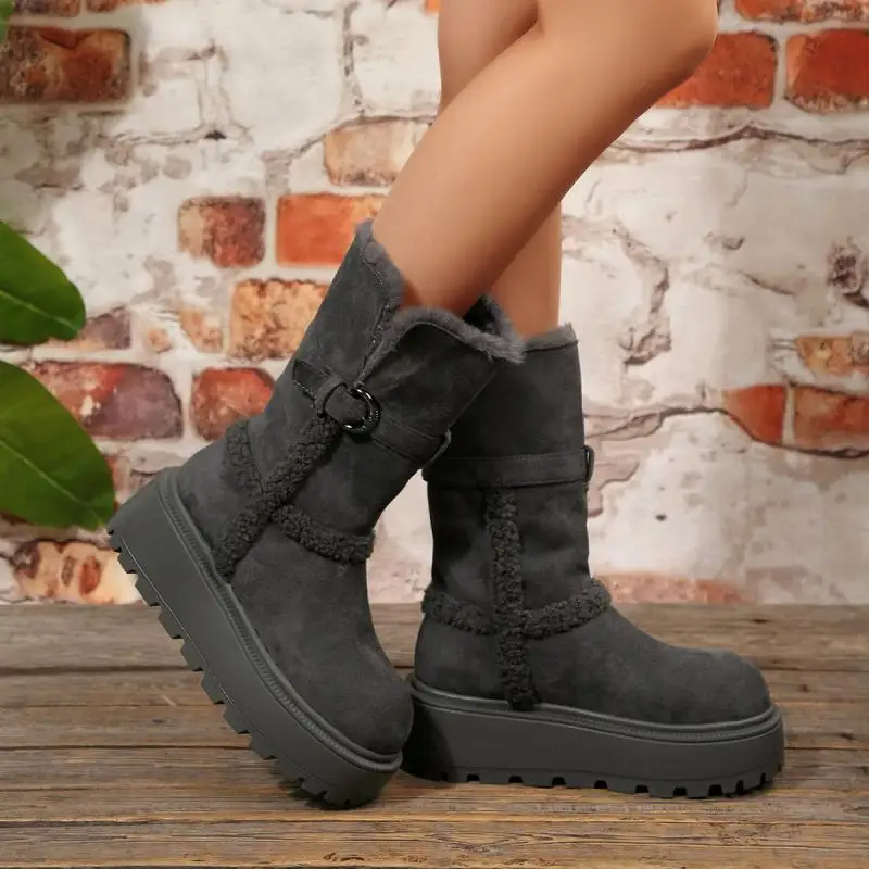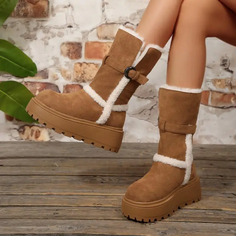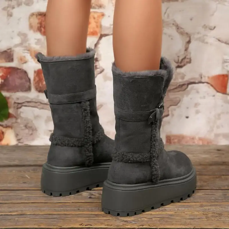 Stivali da neve in pelle scamosciata con fondo spesso caldo lungo peluche Donna 2025 Stivali invernali a metà polpaccio con fibbia in metallo soffice pelliccia Stivaletti alti da donna