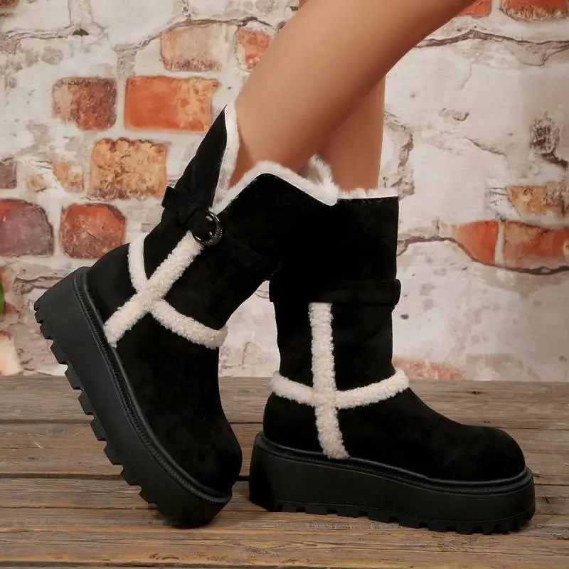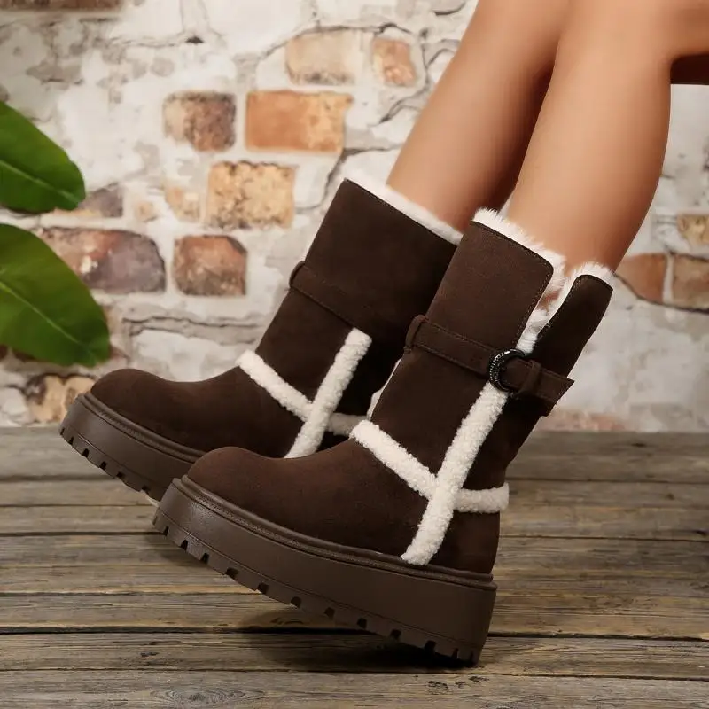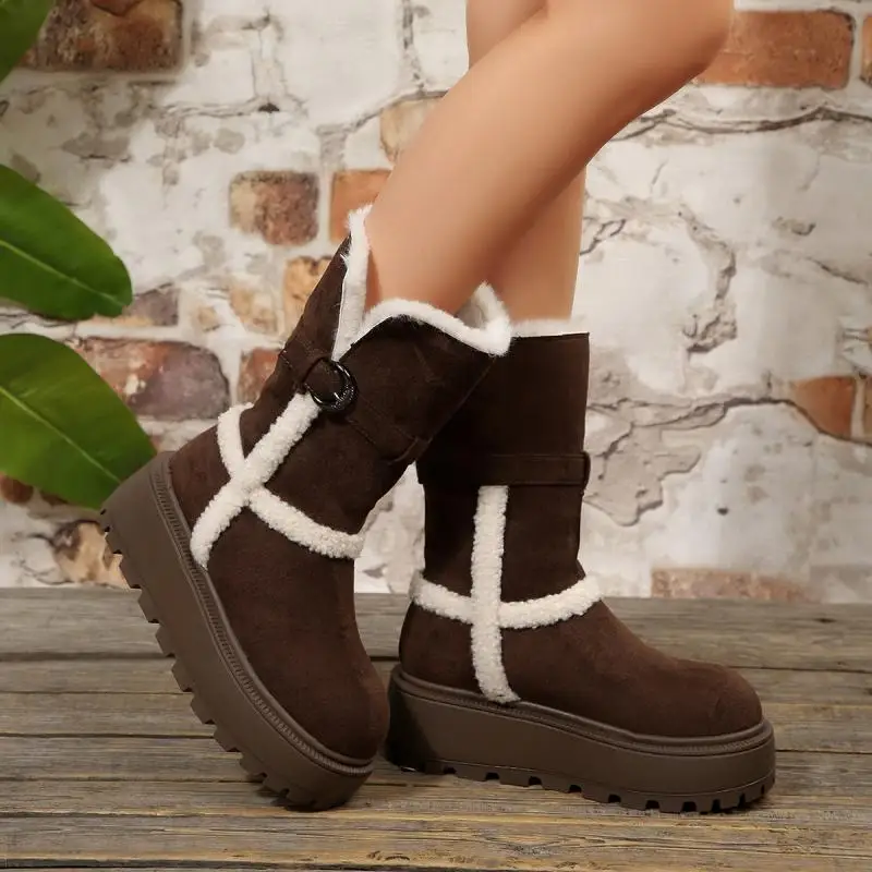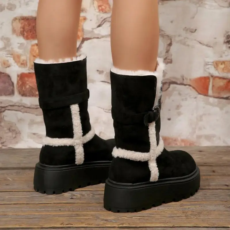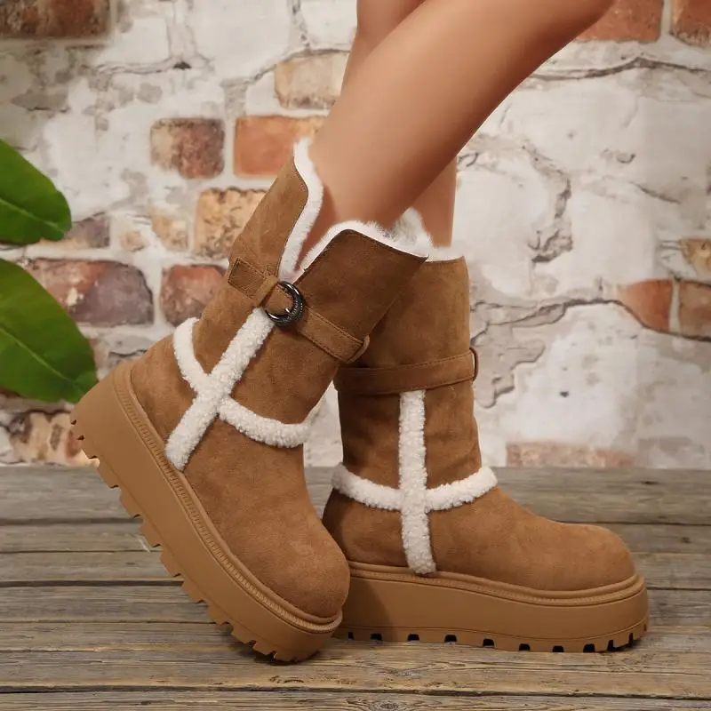 Stivali da neve in pelle scamosciata con fondo spesso caldo lungo peluche Donna 2025 Stivali invernali a metà polpaccio con fibbia in metallo soffice pelliccia Stivaletti alti da donna
