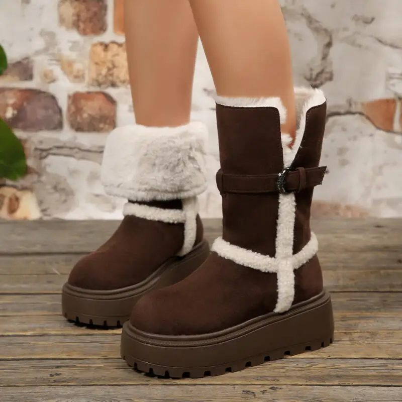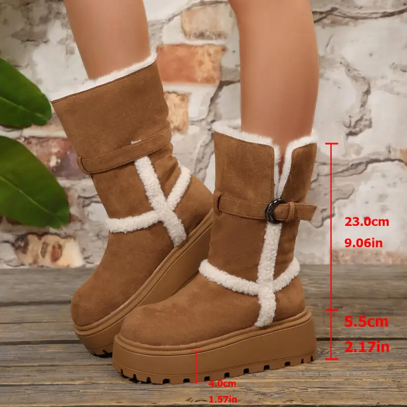Stivali da neve in pelle scamosciata con fondo spesso caldo lungo peluche Donna 2025 Stivali invernali a metà polpaccio con fibbia in metallo soffice pelliccia Stivaletti alti da donna