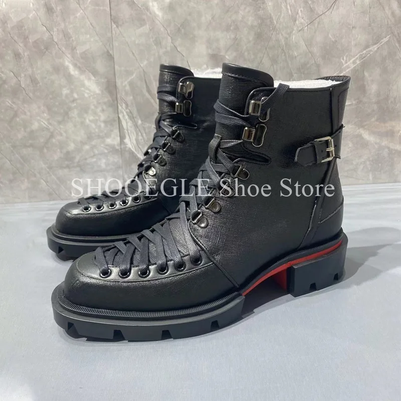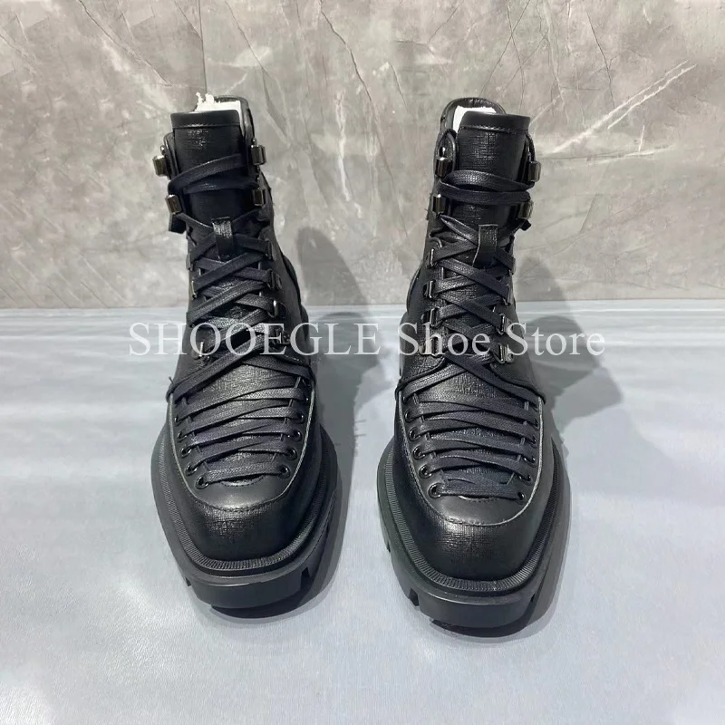 Stivali da uomo con Design allacciato alla moda stivaletti quadrati piccoli in stile britannico nero Casual scarpe da uomo autunno inverno alte