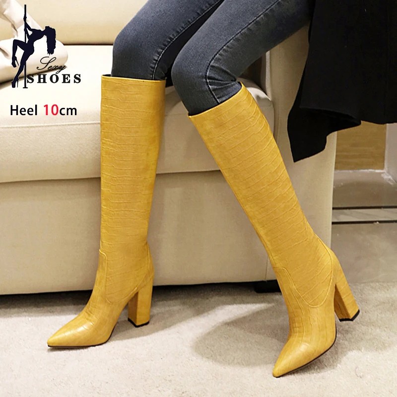 Stivali lunghi da donna primavera autunno in morbida pelle 10 cm tacchi grossi moda punta a punta scarpe invernali taglie forti stivali alti al ginocchio femminili