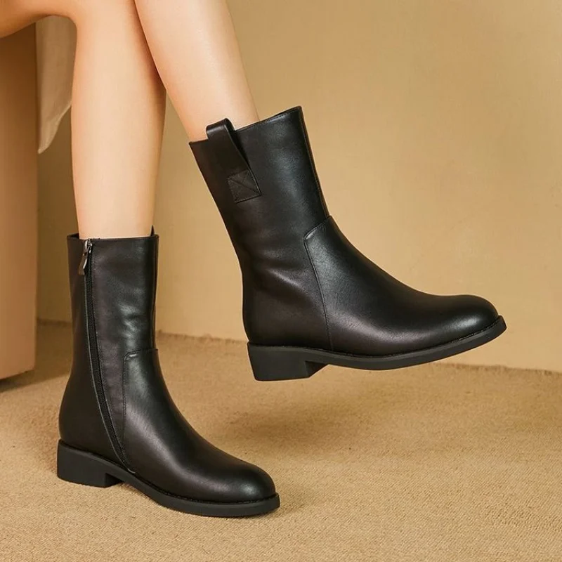 Stivali moda a metà polpaccio2025Nuovi stivali invernali in pelle con suola morbida stile francese con tacco grosso, comodi e versatili, foderati in pile