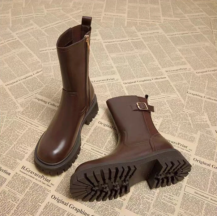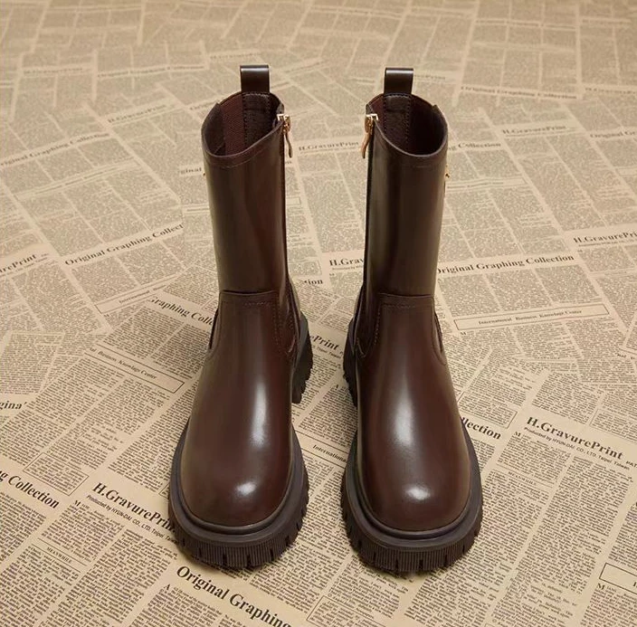 Stivali semi alti da donna Punta tonda Chelsea Scarpe da donna a metà polpaccio Tacco medio Calzature marroni Primavera Autunno Saldi Gotico Demi-stagione