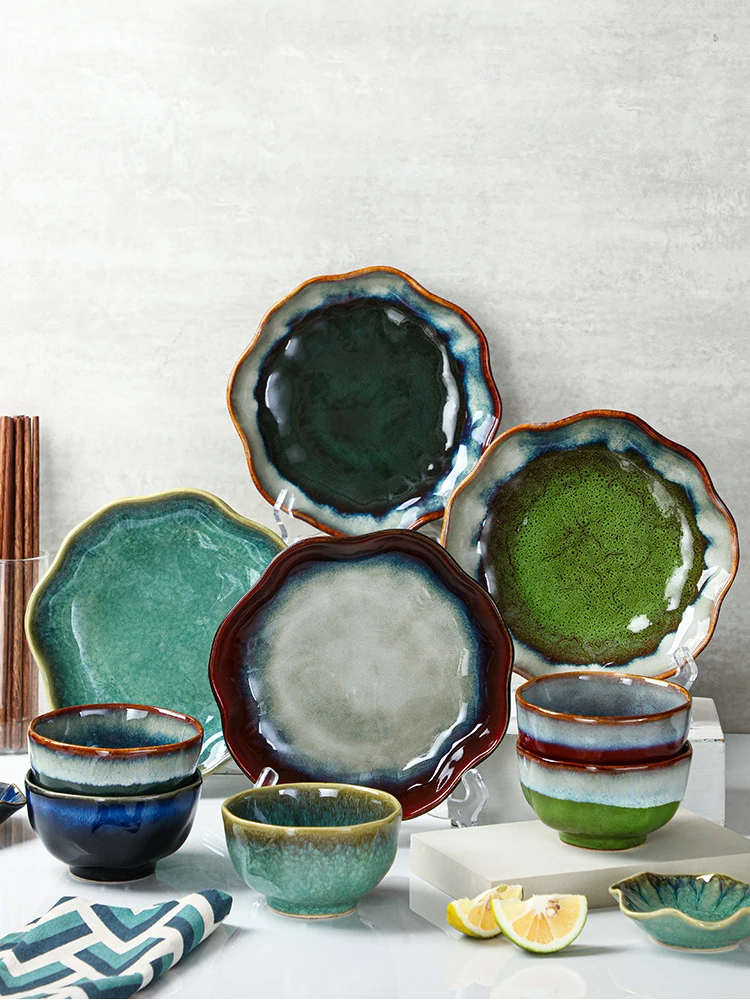 Stoviglie irregolari retrò giapponesi stoviglie in ceramica per la casa piatto/ciotola/piatto Set piatto in ceramica stoviglie stoviglie festa di compleanno