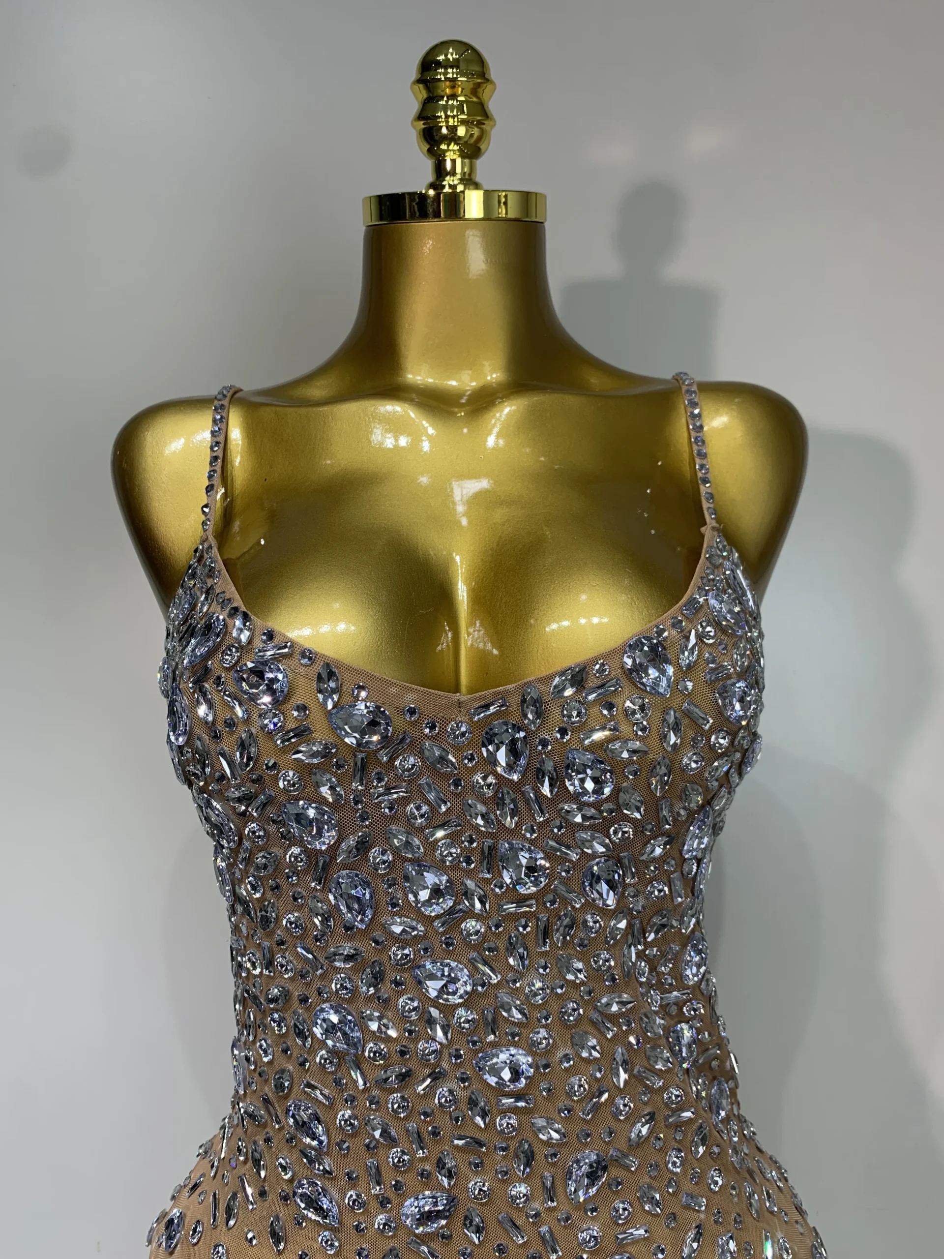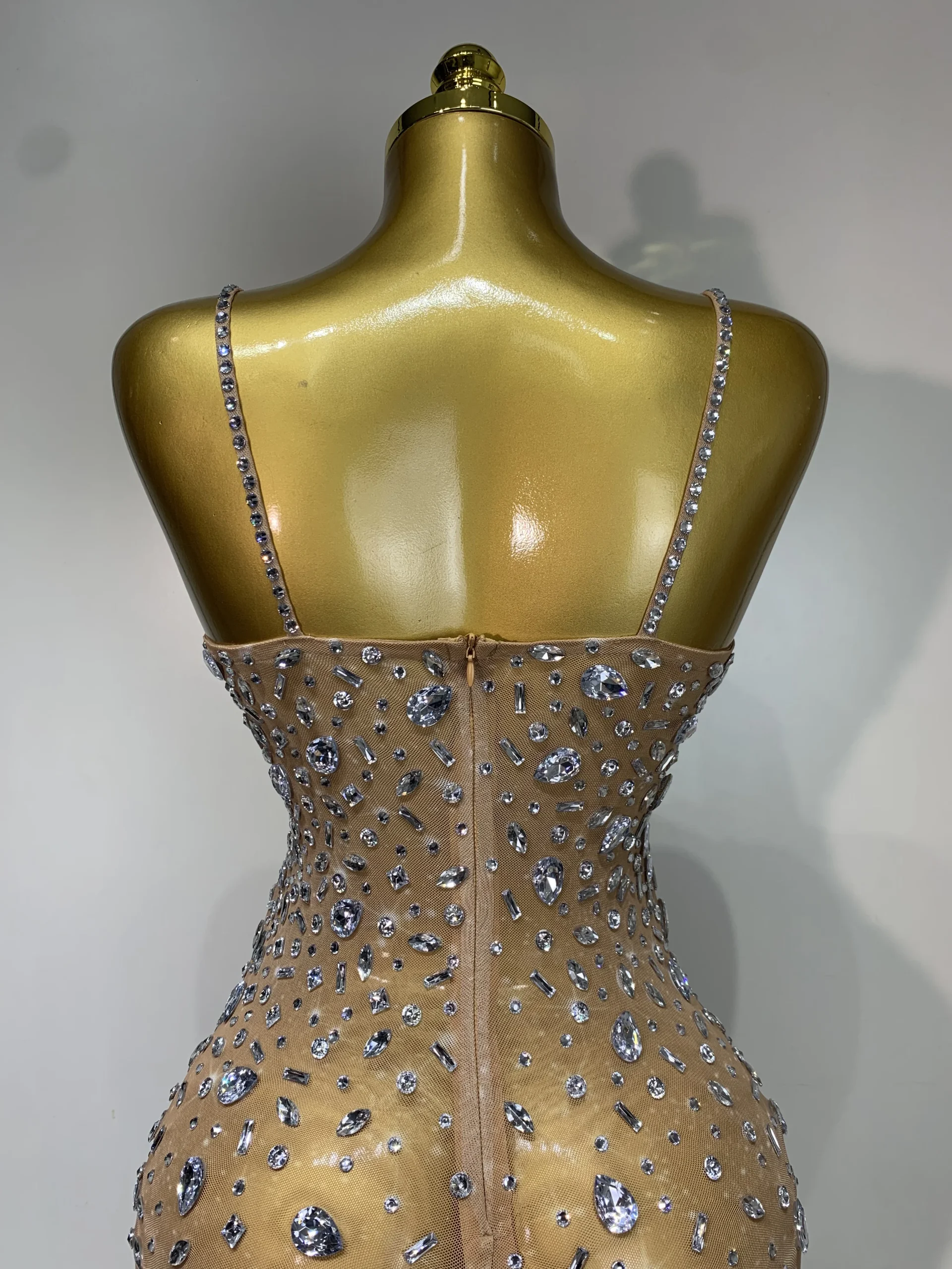 Strass di lusso Maglia sexy trasparente Abito aderente Donna Serata di compleanno Abito da cocktail party Abito da palcoscenico per club sul tappeto rosso