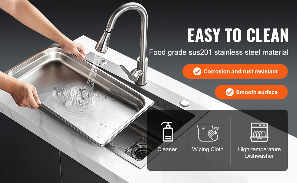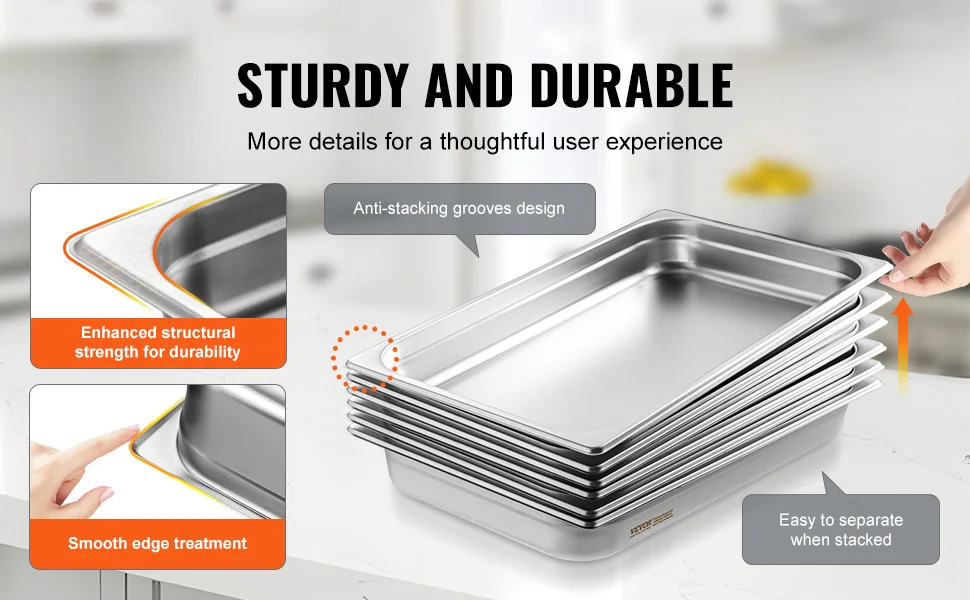 Robusta e durevole: la nostra padella a vapore per hotel è realizzata in acciaio inossidabile spesso 0,8 mm, che la rende robusta, durevole e resistente alla ruggine.L’esclusivo design della scanalatura anti-impilamento migliora la resistenza strutturale, rendendo la padella più robusta e facile da separare quando impilata.