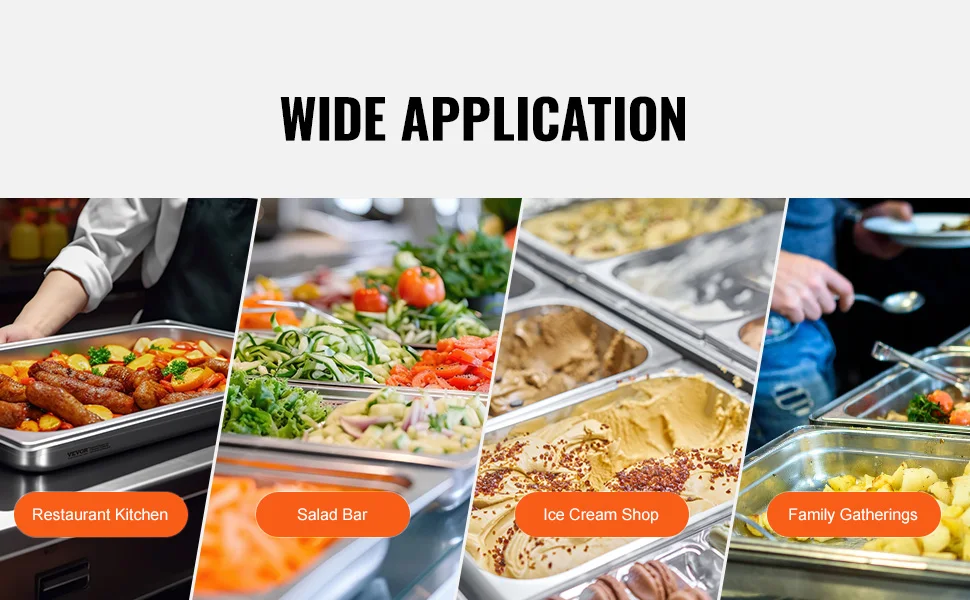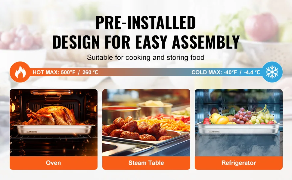 Resistente al calore e al freddo: la padella dell’hotel in acciaio inossidabile può resistere a temperature fino a 500℉ / 260℃ e fino a -40℉ / -40℃.È adatto per l’uso in frigoriferi, congelatori, forni e tavoli a vapore.