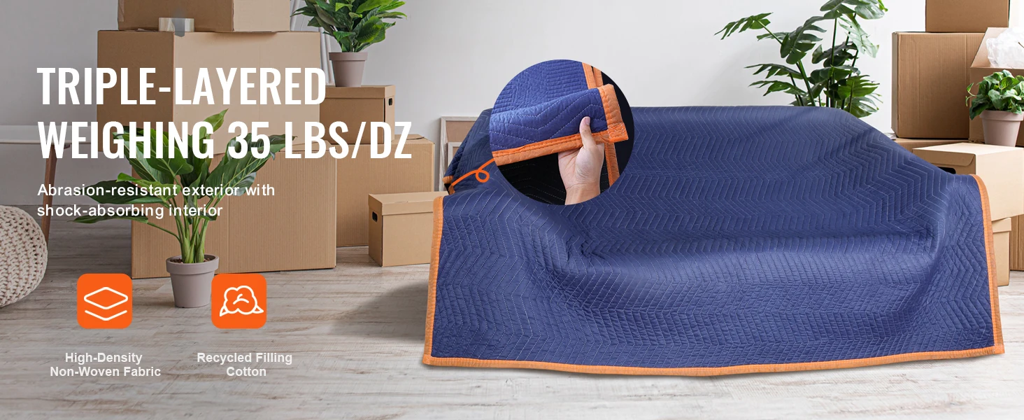 Tripla protezione: pensare come un torta tripla strato per i tuoi validi.Tessuto non tessuto double face più cotone riciclato equivale una coperta da imballaggio sia robusta e gentile ai tuoi oggetti.Con avvolgimento con bordi e superficie impermeabile, è costruito per resistere alla massima tensione e alla pressione.