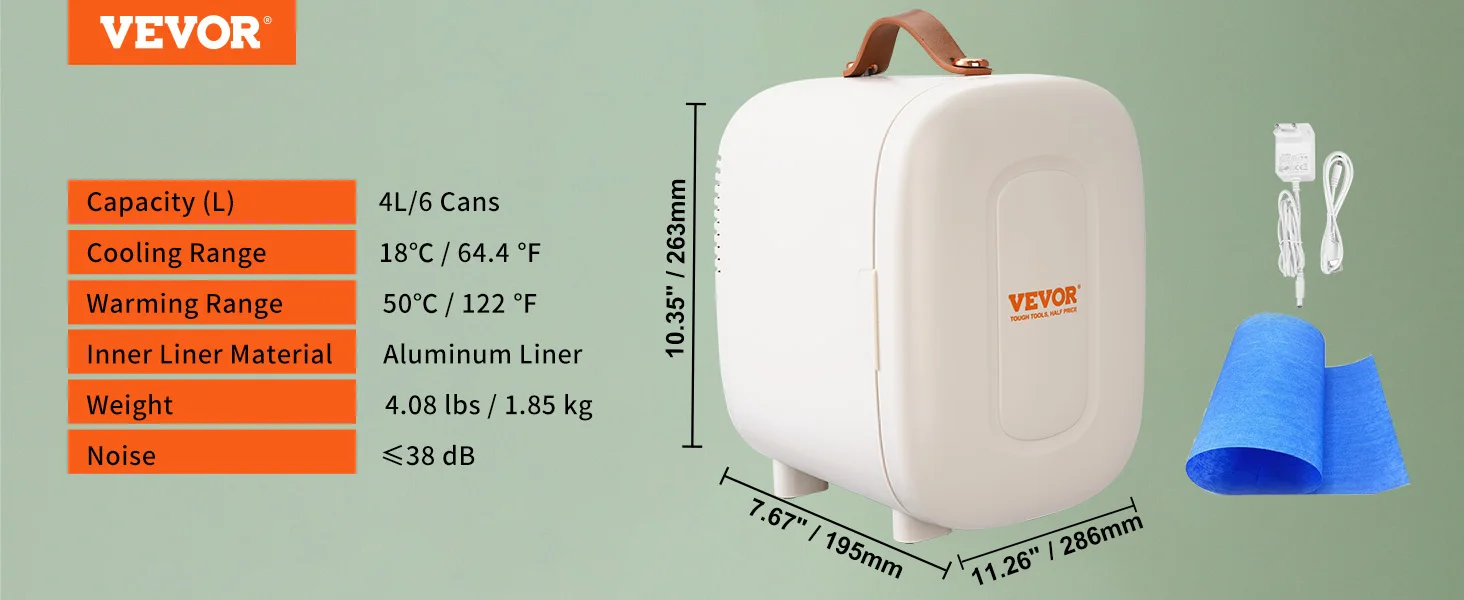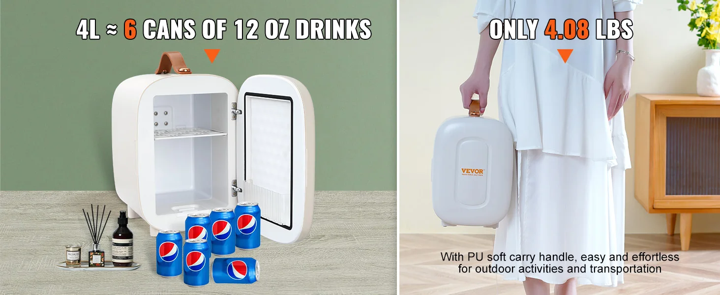Compatto ma spazioso: il nostro mini-frigorifero presenta un corpo piccolo, ma può contenere fino a sei lattine da 330 ml nella sua capacità di 4 litri, con un peso di soli 4,08 libbre.La sua morbida maniglia in PU lo rende portatile e facile da trasportare, ideale per conservare cibo, bevande, latte materno, prodotti per la cura della pelle, medicine e altro ancora.