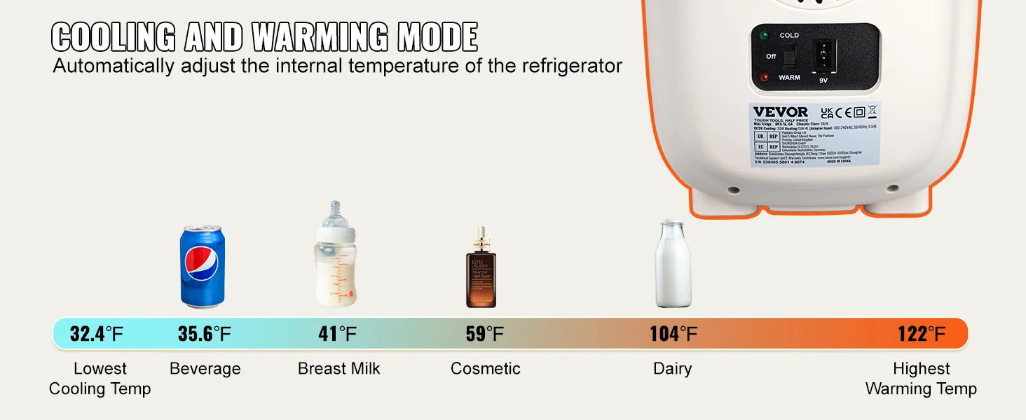 Raffreddamento e riscaldamento: il nostro mini frigorifero è dotato sia di funzioni di raffreddamento che di riscaldamento, che consentono di regolare la modalità sulla temperatura desiderata.La modalità di raffreddamento può raggiungere meno di 64,4℉ temperatura ambiente, mentre la modalità di riscaldamento può arrivare fino a 122℉ temperatura ambiente.Ci vuole solo un’ora per ottenere il corrispondente effetto di raffreddamento.