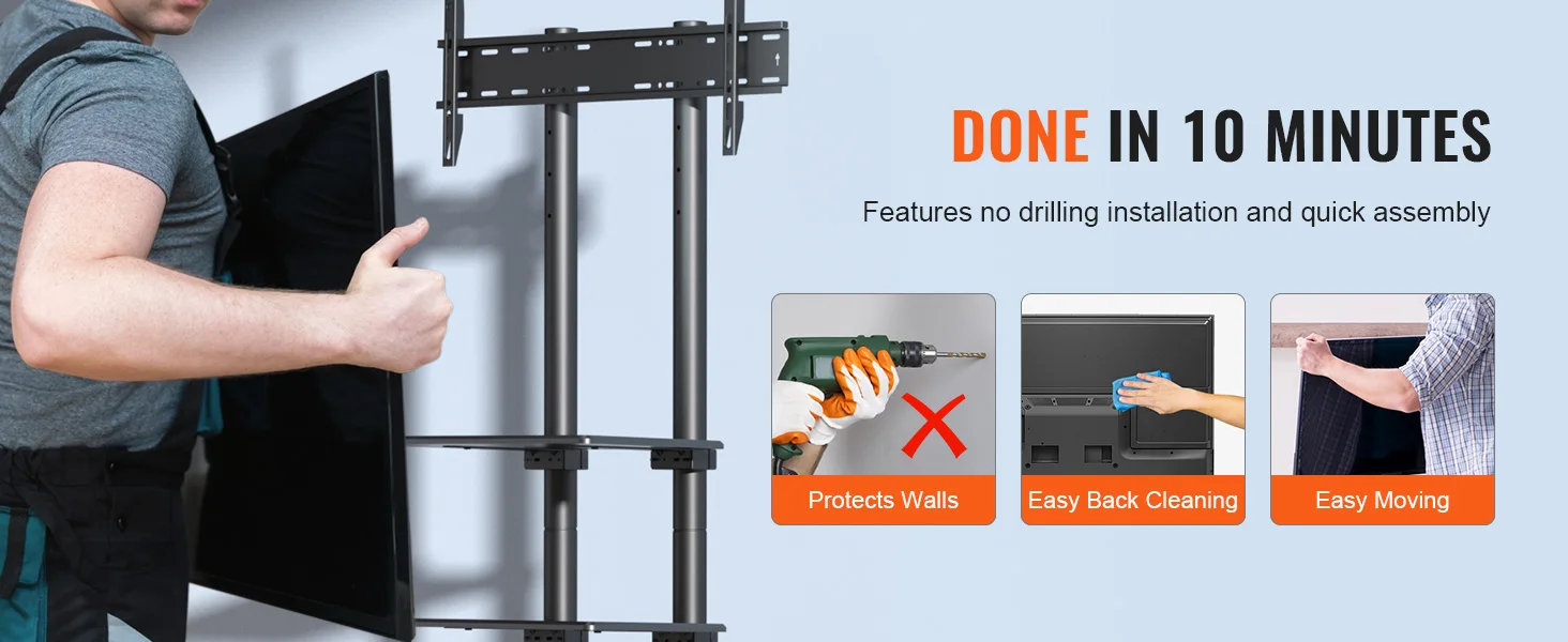Il supporto TV con rotelle può essere assemblato in soli 10 minuti senza foratura, che può proteggere meglio le tue pareti.Il suo design indipendente rende facile da spostare a qualsiasi stanza.