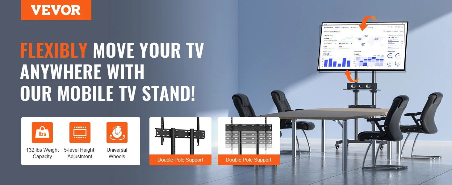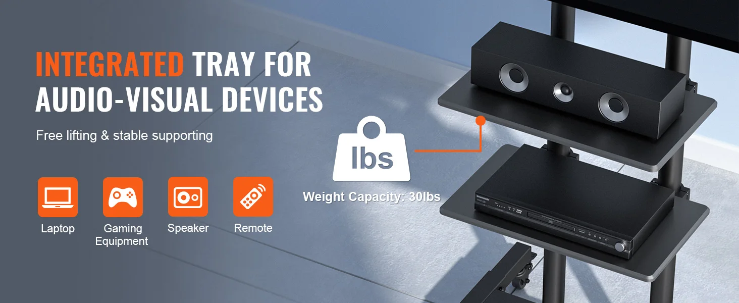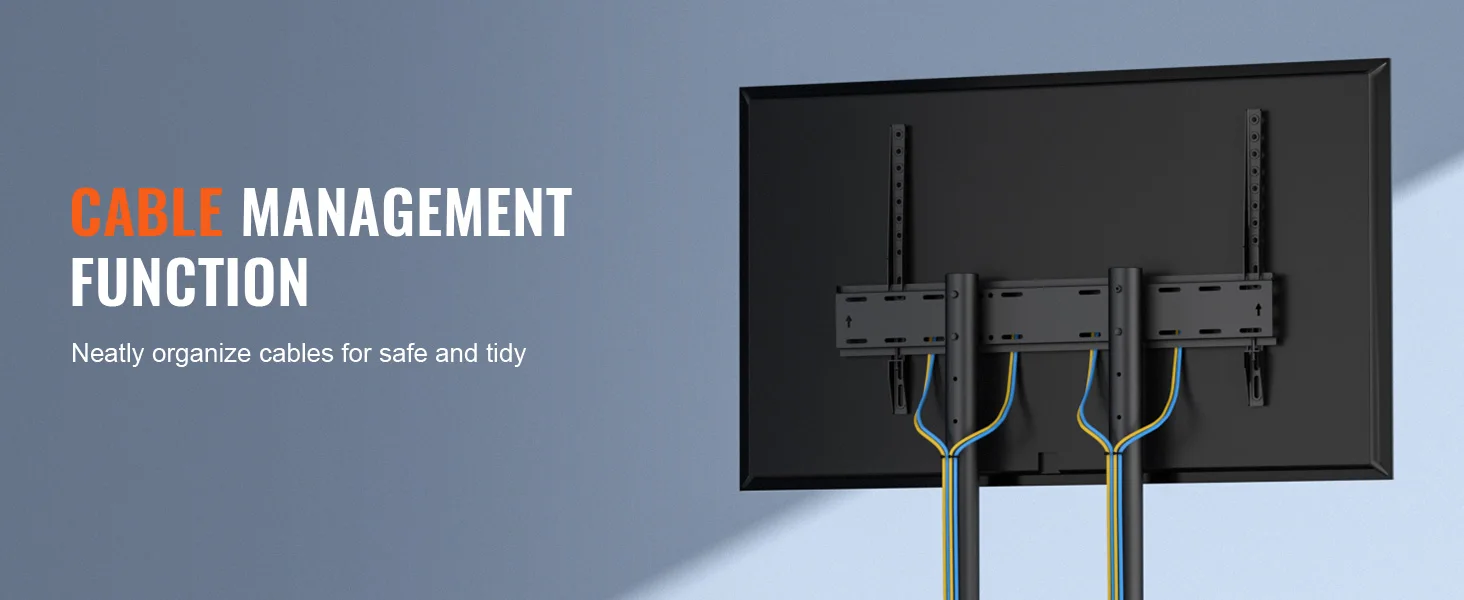 Con un design senza sospensione, non danneggerà il muro e può essere facilmente spostato ad altri spazi con ruote universali.L’altezza regolabile può soddisfare le vostre diverse esigenze.La gestione dei cavi e i vassoi a doppio strato aiutano a organizzare i fili e i cavi.
