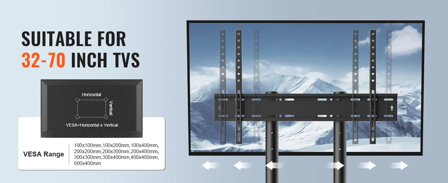 Il supporto per supporto TV è compatibile con VESA di piccole dimensioni da 4×4 pollici/100×100 mm fino a 16×24 pollici (400×600)/ 16×16 pollici (400×400) mm, raccordo TV 32-70/ 23-60 pollici.
