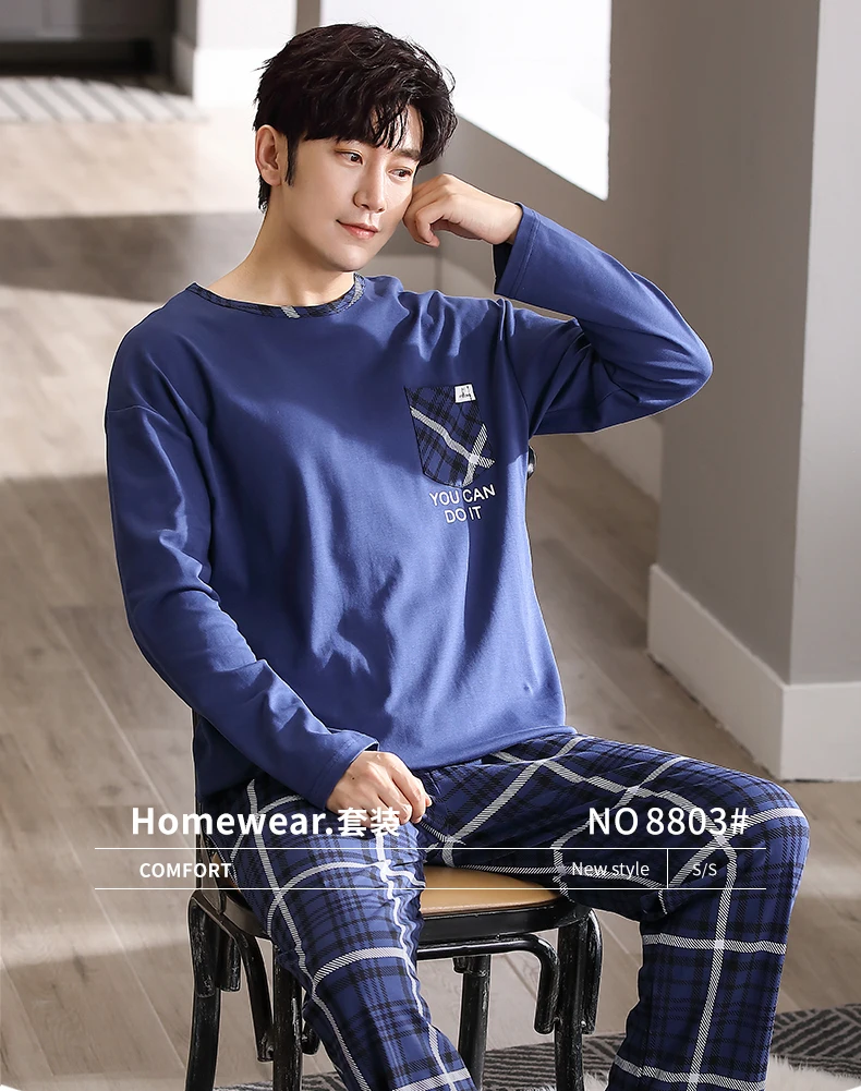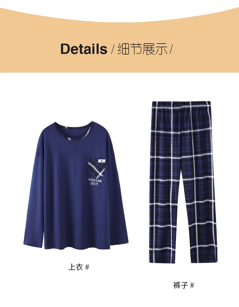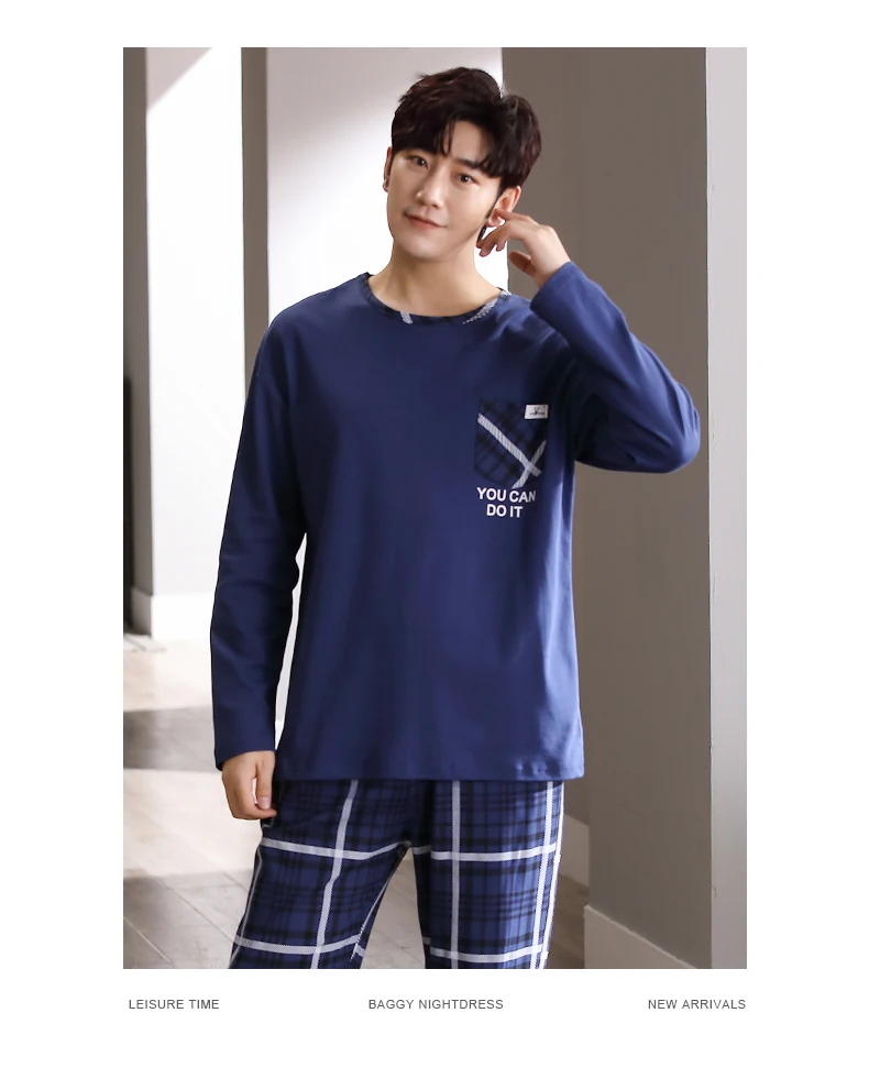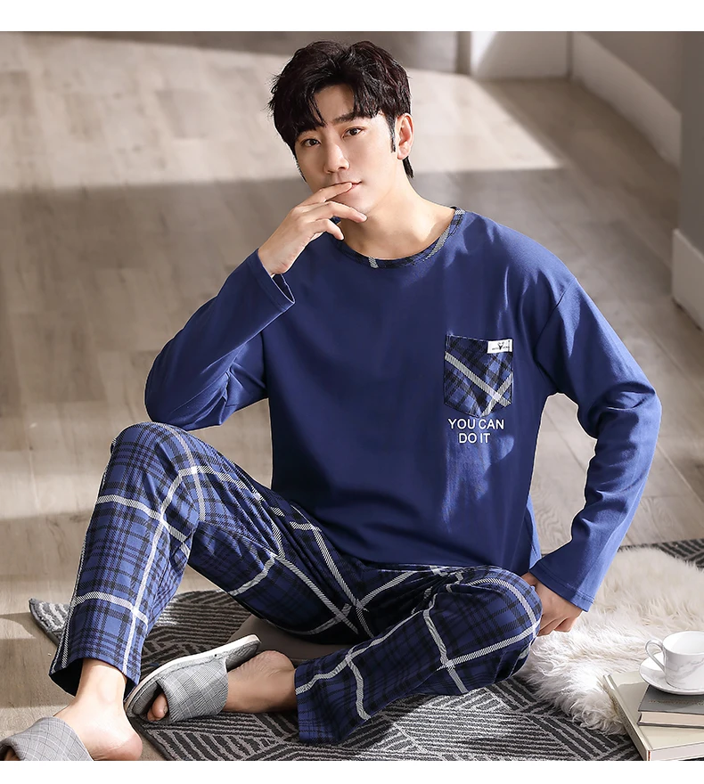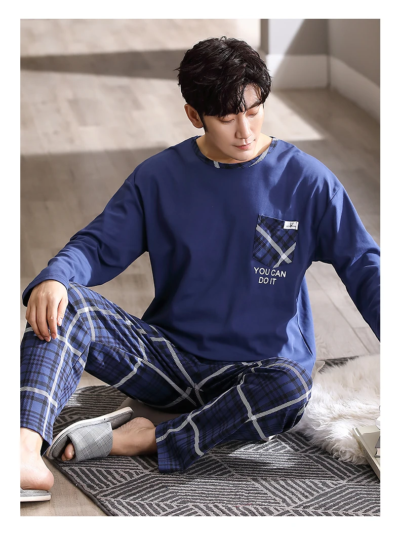 SUKAE Luxury Navy Mens Sleepwear Autunno Inverno Nuovo Cotone Uomo Pigiama Maniche Lunghe Homewear Gentleman L-4XL Grande Pijama Minimalista