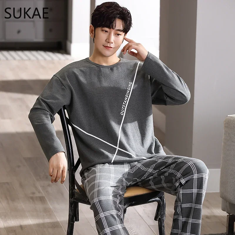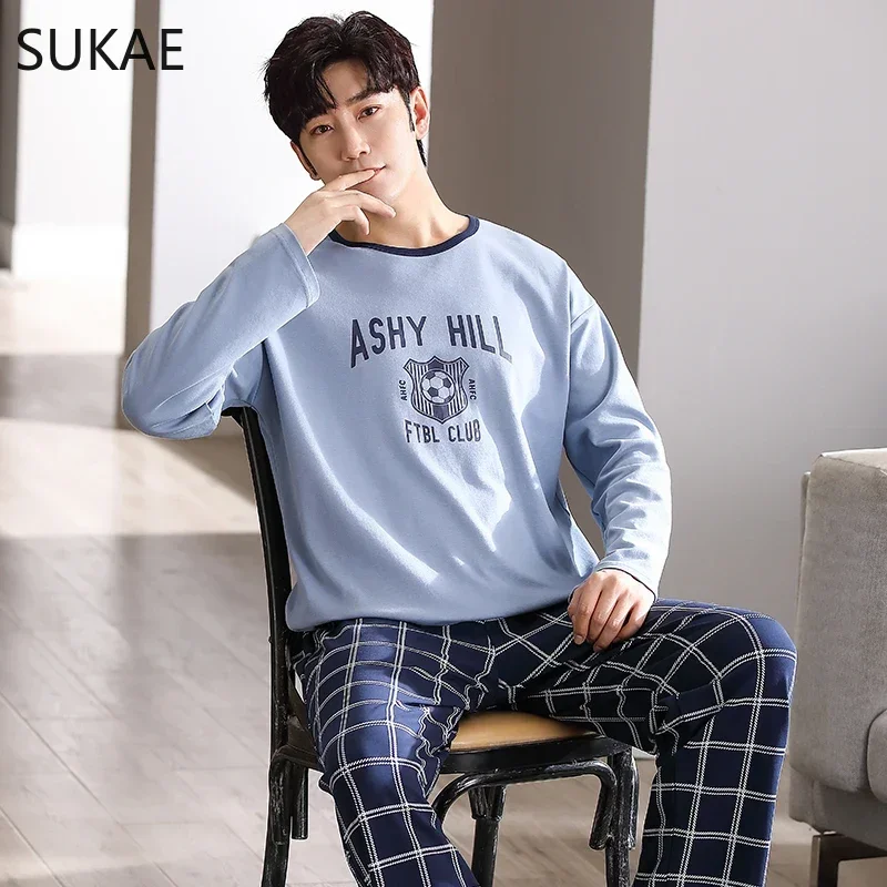 SUKAE Luxury Navy Mens Sleepwear Autunno Inverno Nuovo Cotone Uomo Pigiama Maniche Lunghe Homewear Gentleman L-4XL Grande Pijama Minimalista