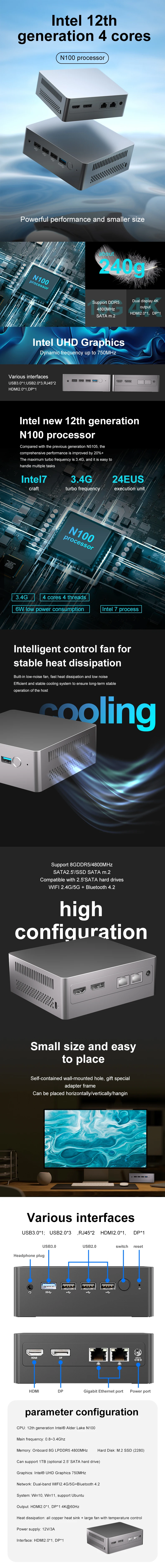 Interfaccia: HDMI2.0 * 1, DP * 1, USB3.0*1; USB2.0 * 3, porta Gigabit RJ45 * 2, connettore combinato per cuffie e microfono * 1, slot per scheda TF * 1