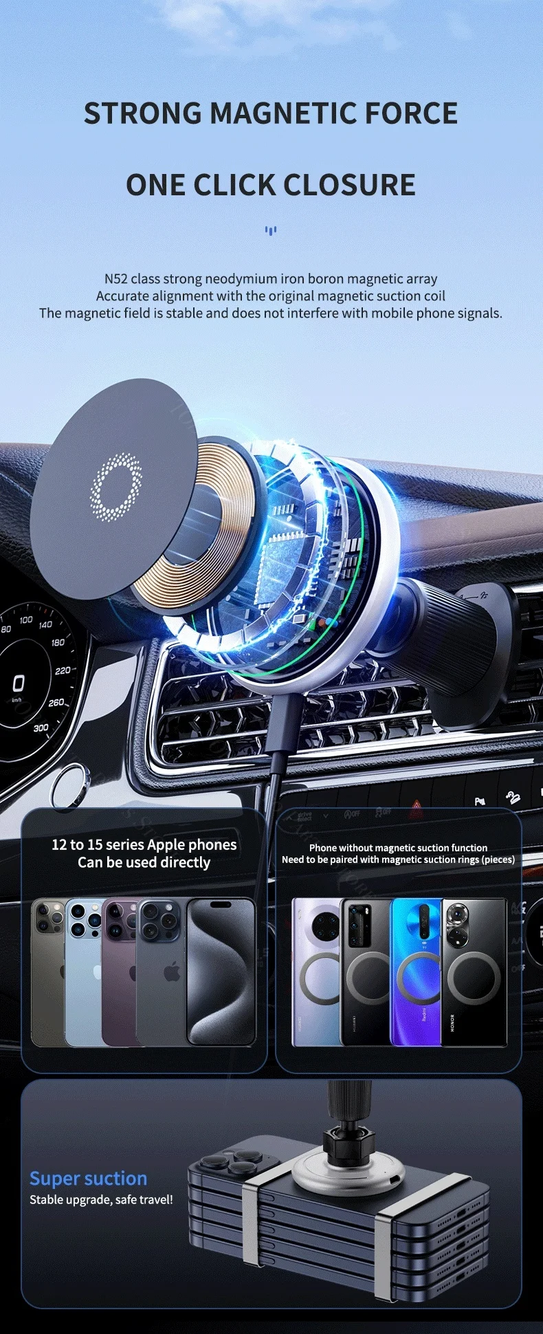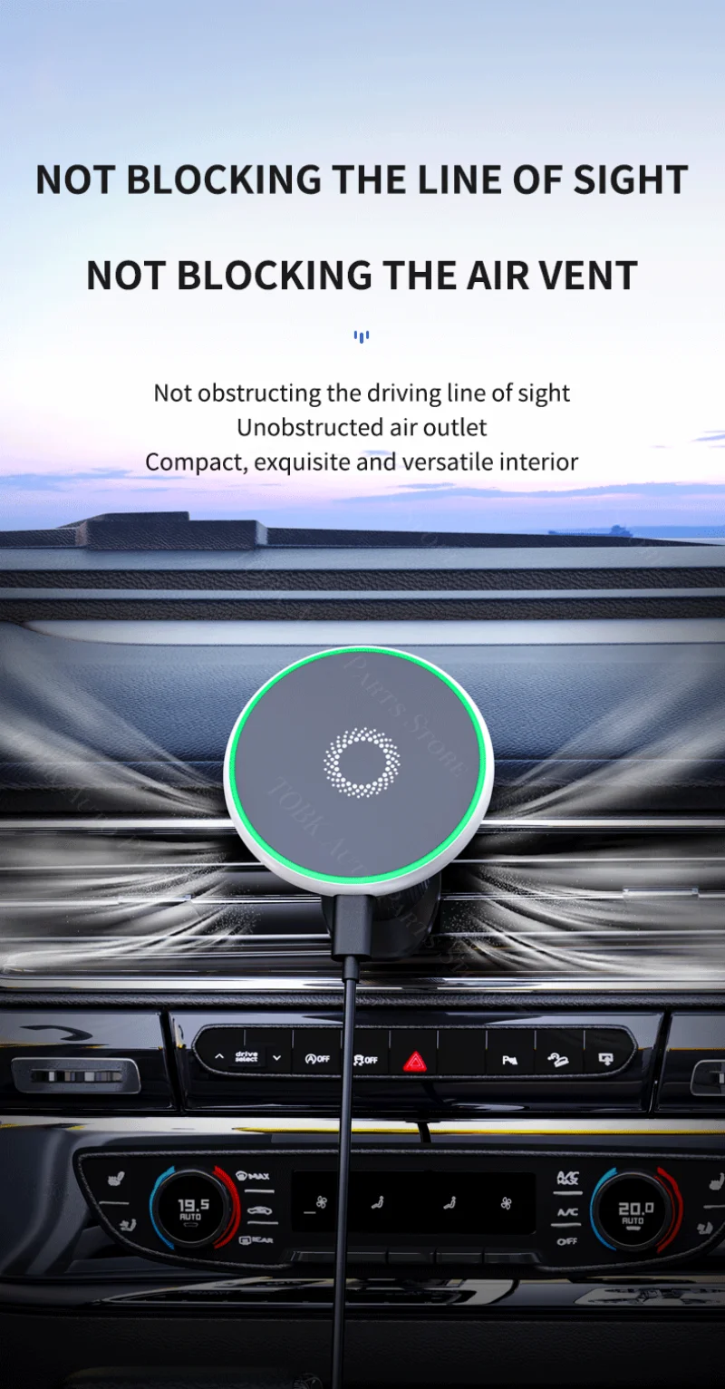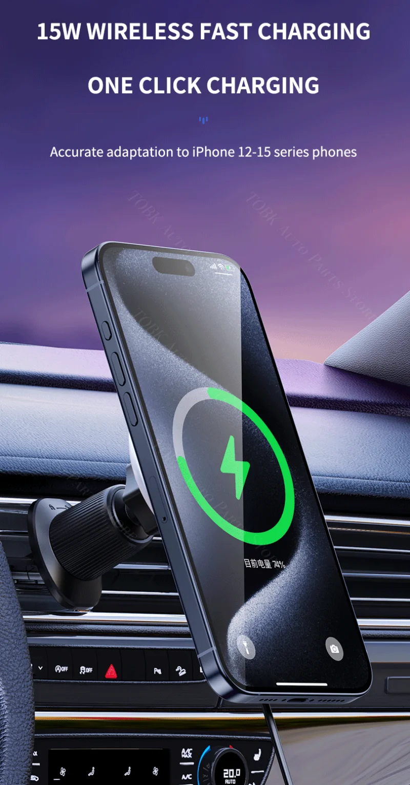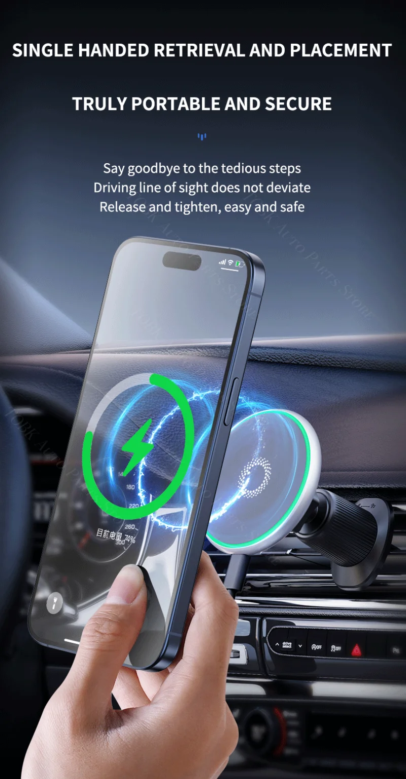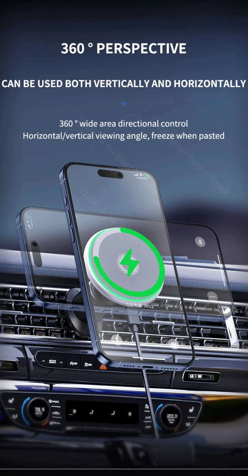 Il supporto magnetico per telefono da auto non è solo un supporto; è una stazione di ricarica wireless che supporta la ricarica rapida da 15 W per i tuoi dispositivi compatibili.È dotato di un chip intelligente AI che riconosce automaticamente il modello del tuo telefono e avvia la ricarica rapida, garantendo che il tuo dispositivo rimanga acceso durante il viaggio.La bobina di ricarica wireless del supporto è progettata per essere efficiente e durevole, offrendo un’esperienza di ricarica affidabile ogni volta che la usi.Che tu stia navigando in città o godendoti la tua playlist preferita, questo supporto garantisce che il tuo telefono sia sempre a portata di mano e acceso.