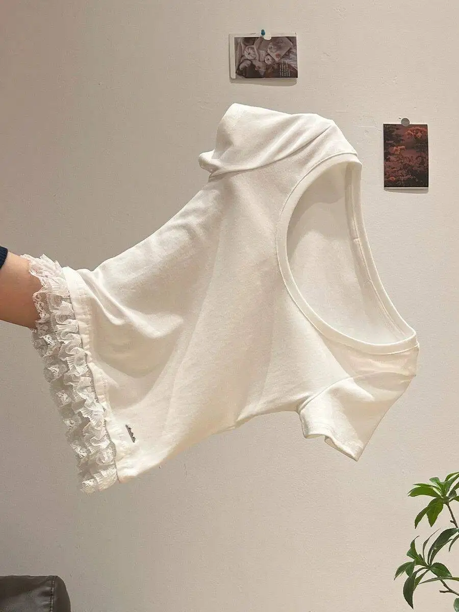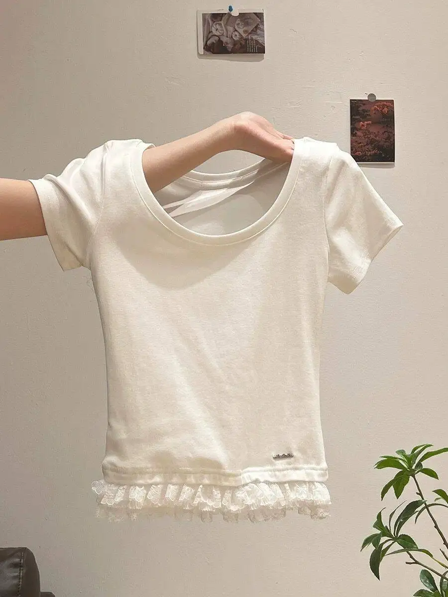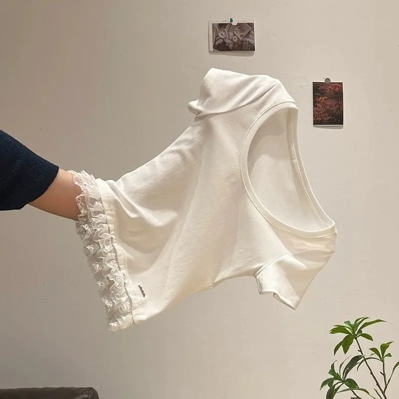 T-shirt a maniche corte con collo rotondo impiombato in pizzo di puro cotone Nuova giacca estiva slim per il corpo 2025
