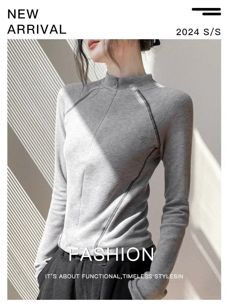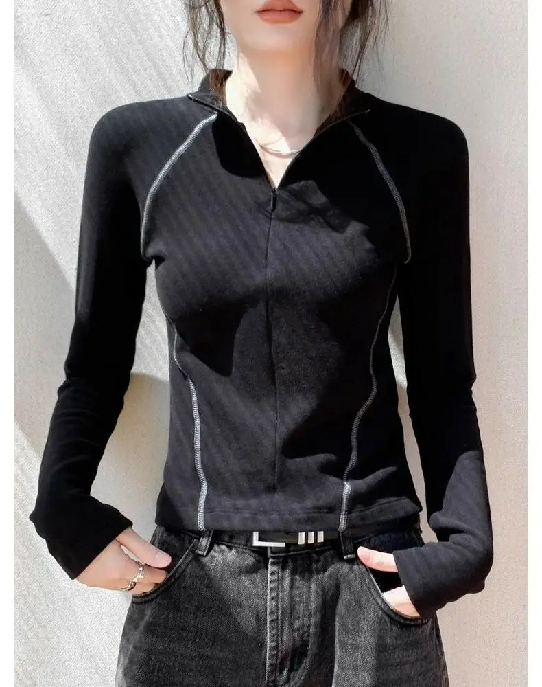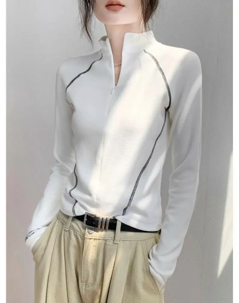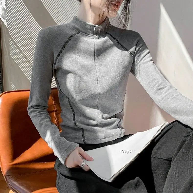 T-shirt a maniche lunghe tedesca Vel a doppia faccia con collo a mezza tartaruga con cerniera per donna in autunno e inverno Top base calda interna sottile