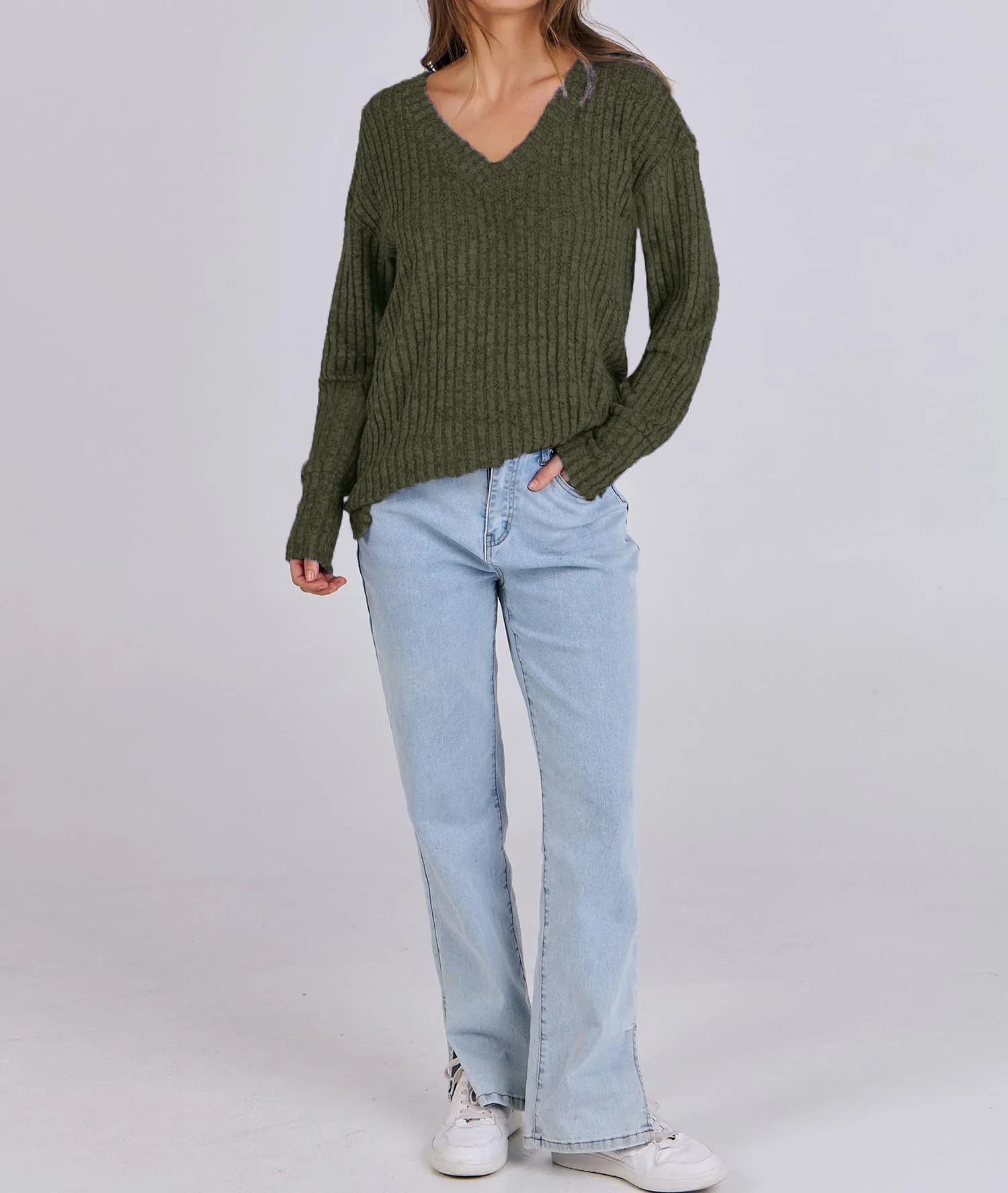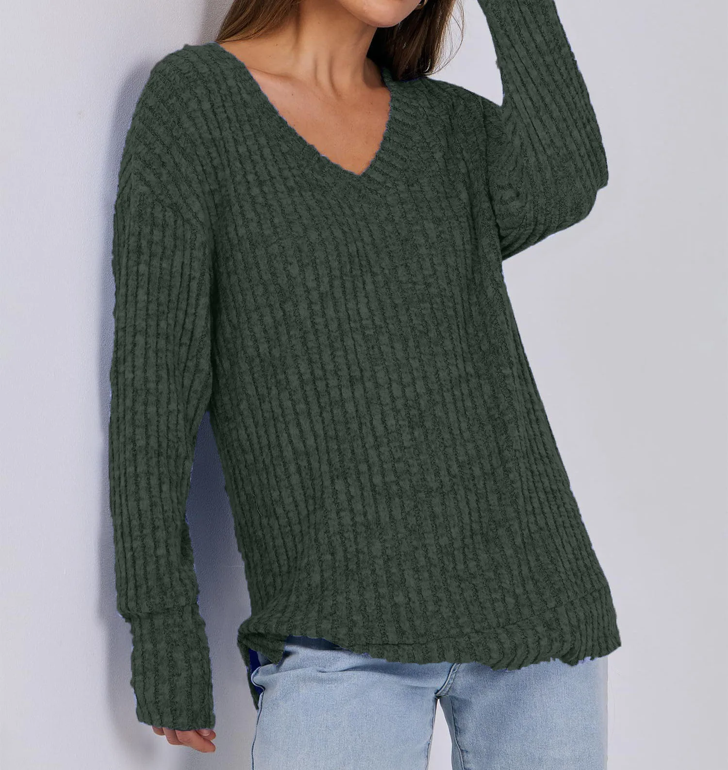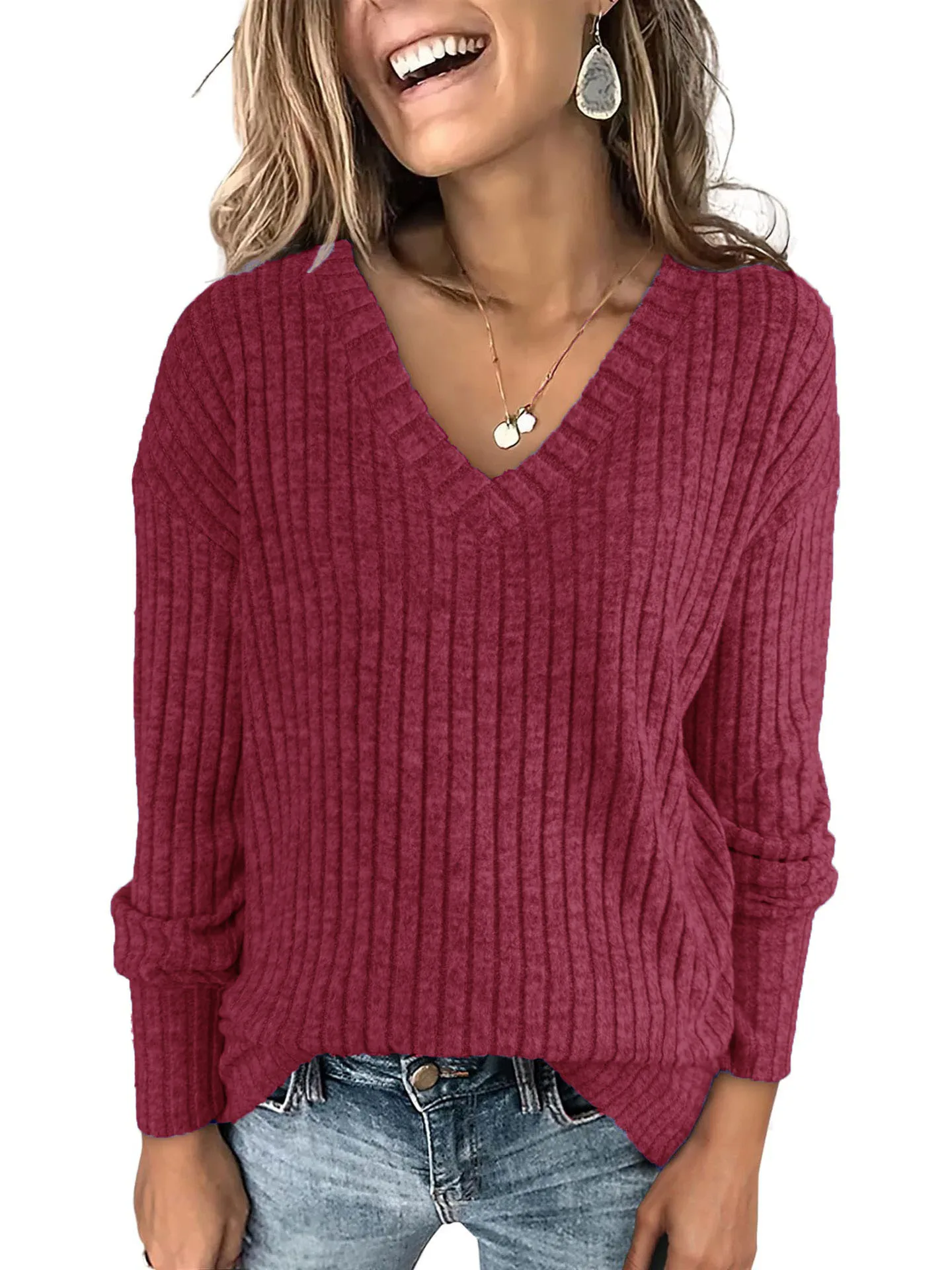 T-shirt da donna a maniche lunghe con scollo a V Top con temperamento alla moda fresato a righe
