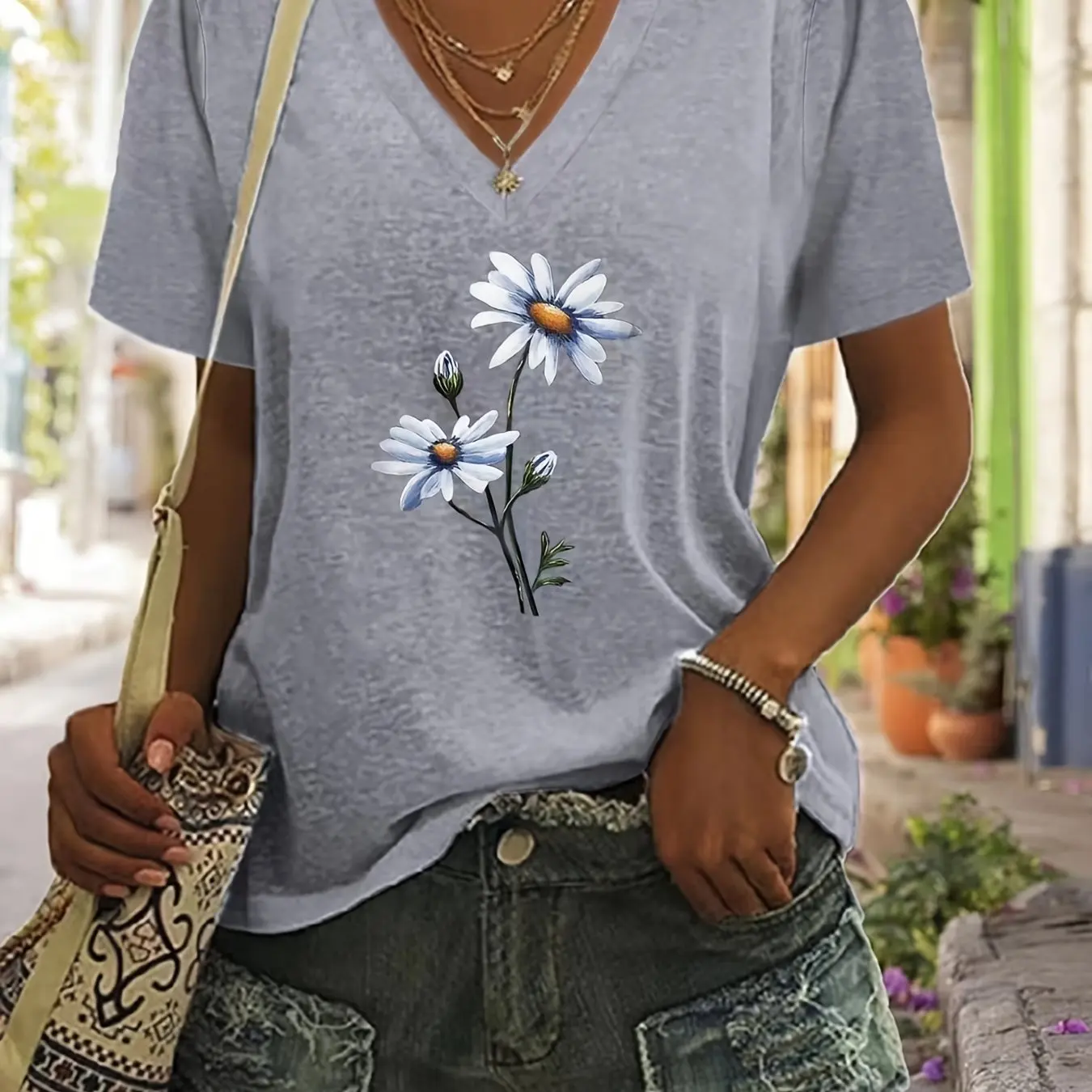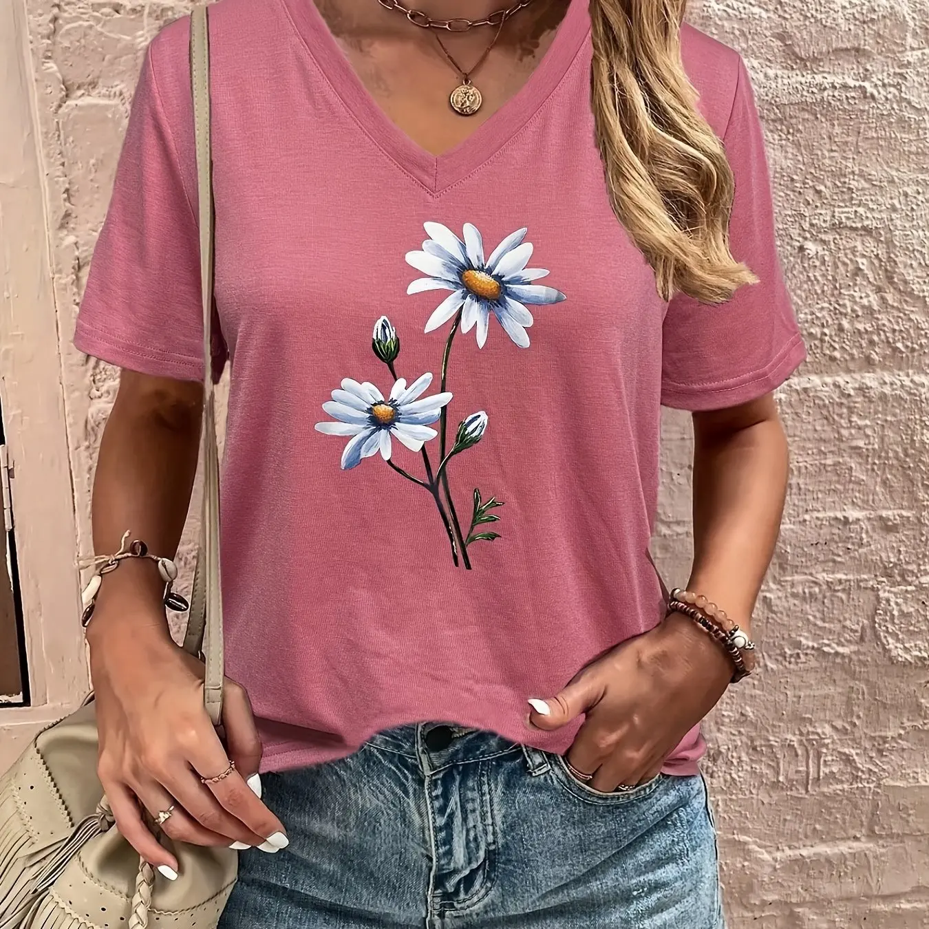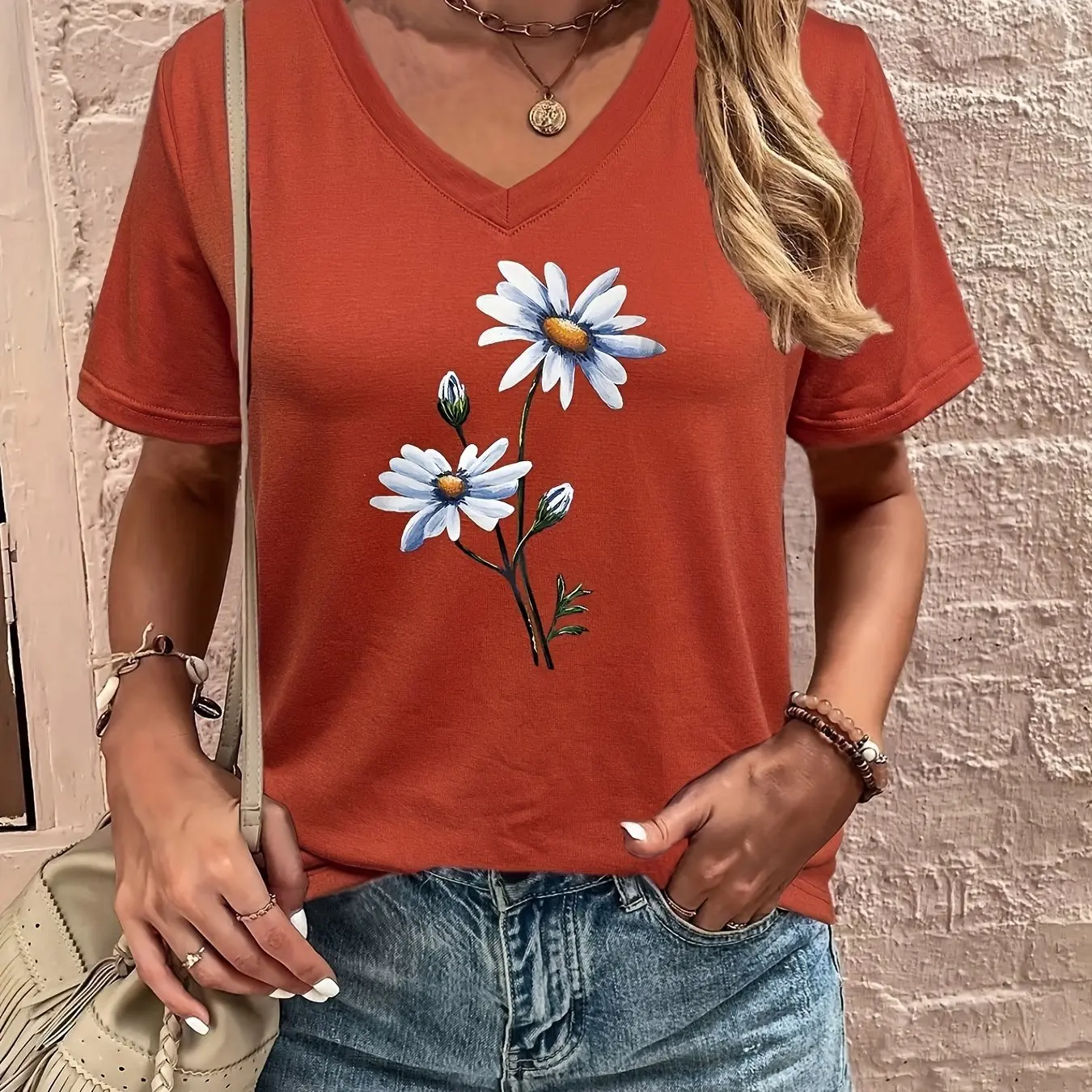 T-shirt da donna con stampa floreale con scollo a V T-shirt moda estiva camicetta casual moda di strada abbigliamento da donna oversize