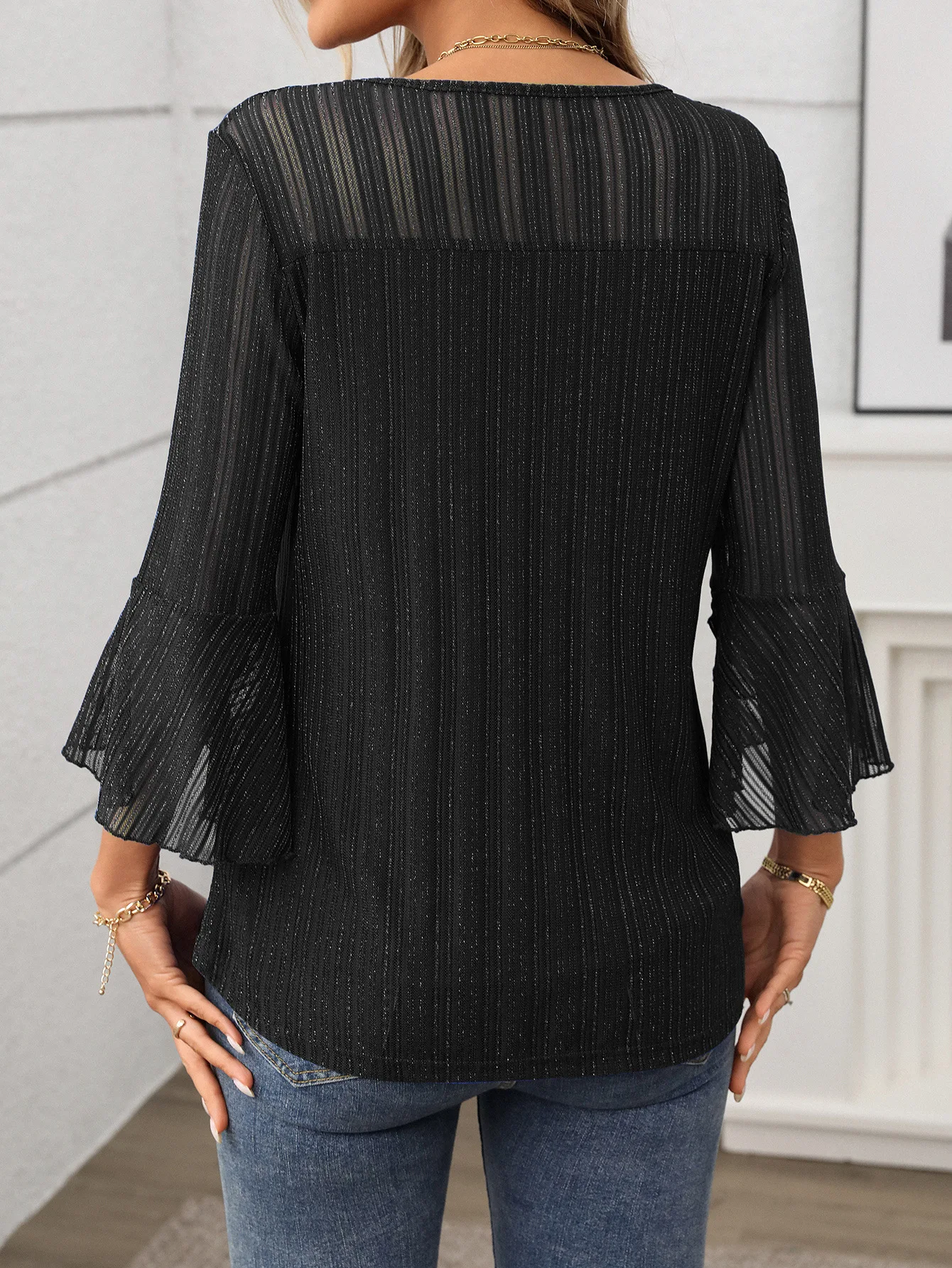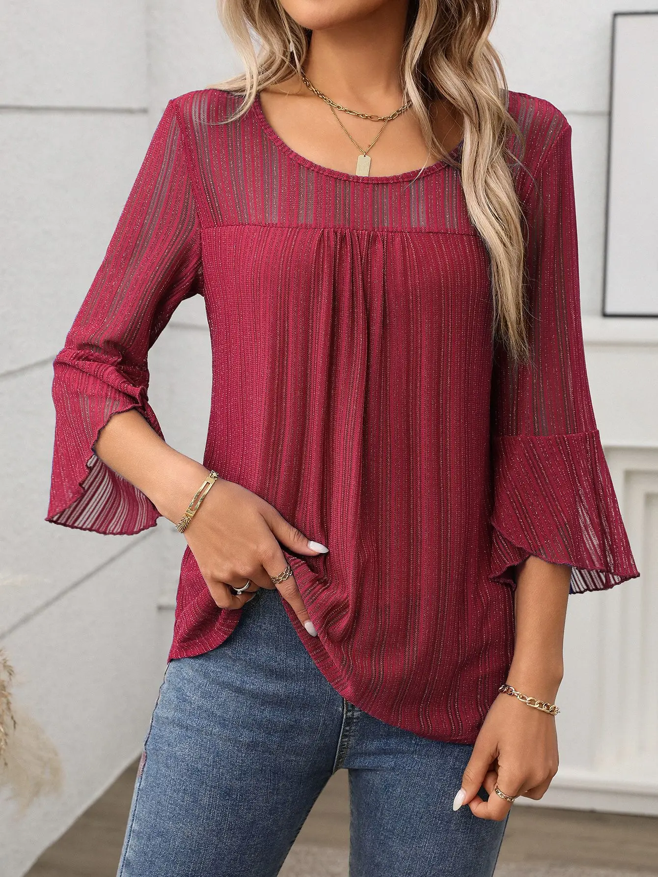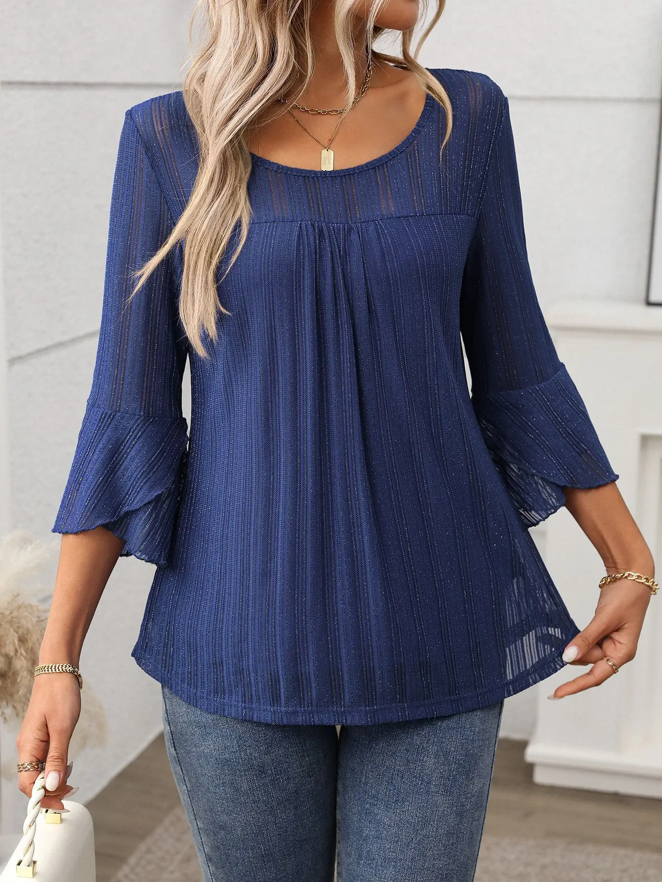 T-shirt da donna primaverili ed estive Maniche a foglia di loto O-Collo Moda elegante pullover in rete Top T-shirt semplici e versatili in seta brillante