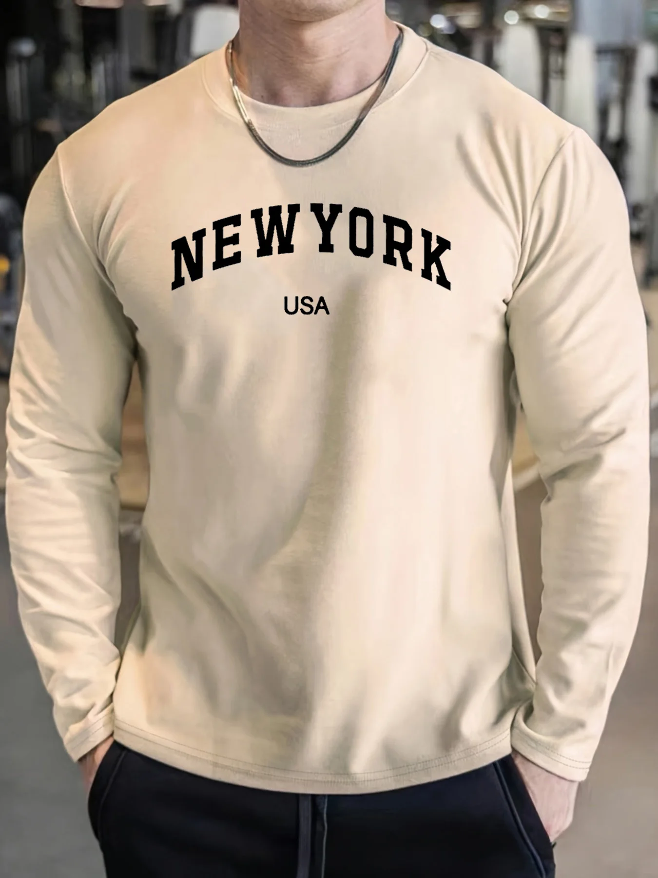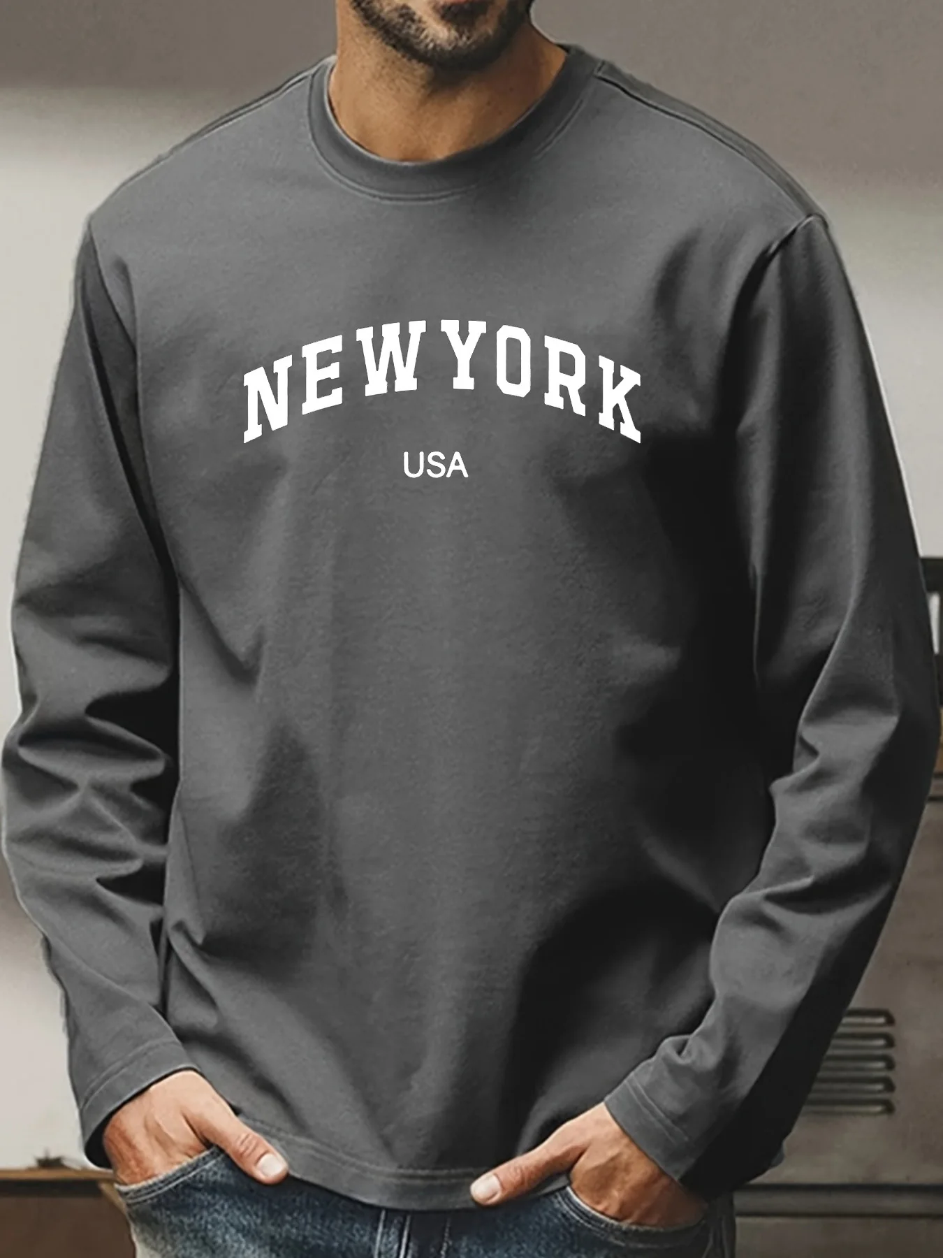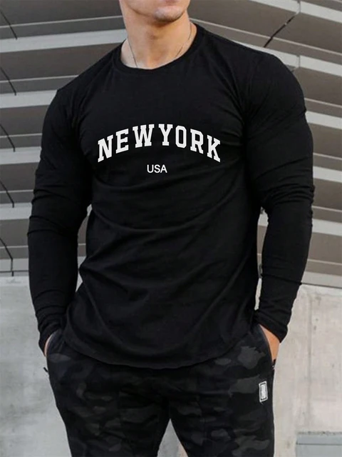 T-shirt da uomo a maniche lunghe con collo rotondo stampato 100% puro cotone, comoda, sportiva, casual, ampia, taglie forti, New York USA