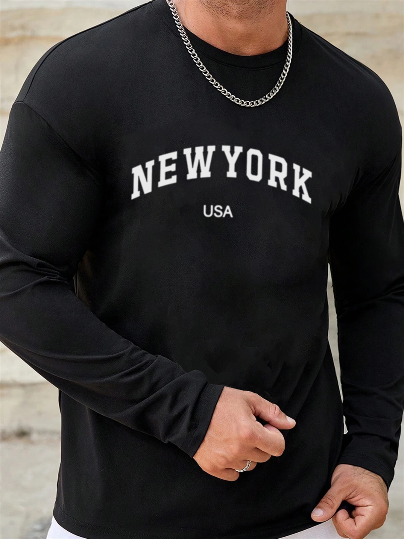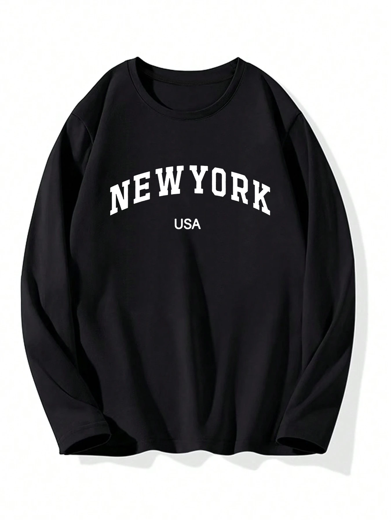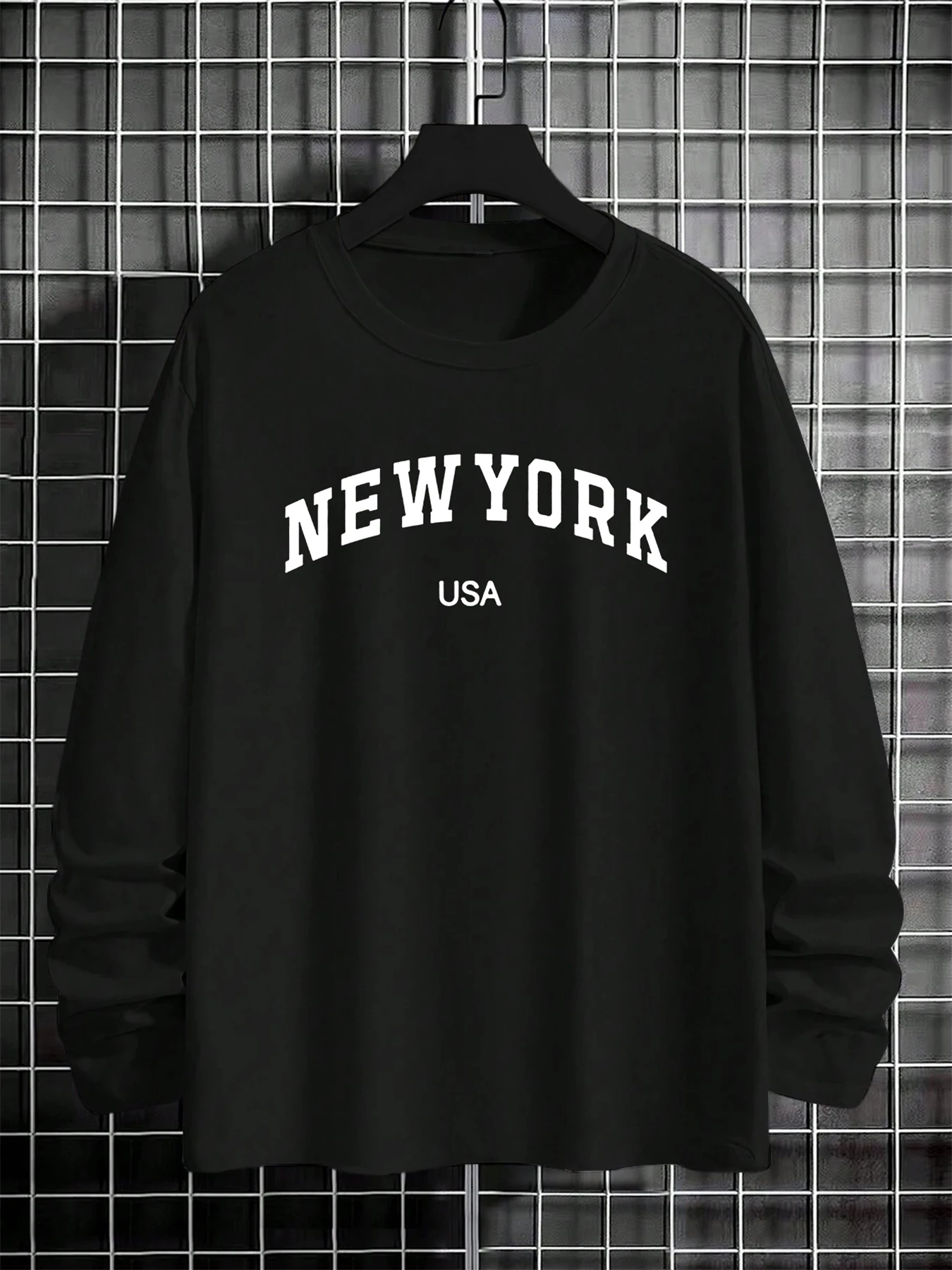 T-shirt da uomo a maniche lunghe con collo rotondo stampato 100% puro cotone, comoda, sportiva, casual, ampia, taglie forti, New York USA