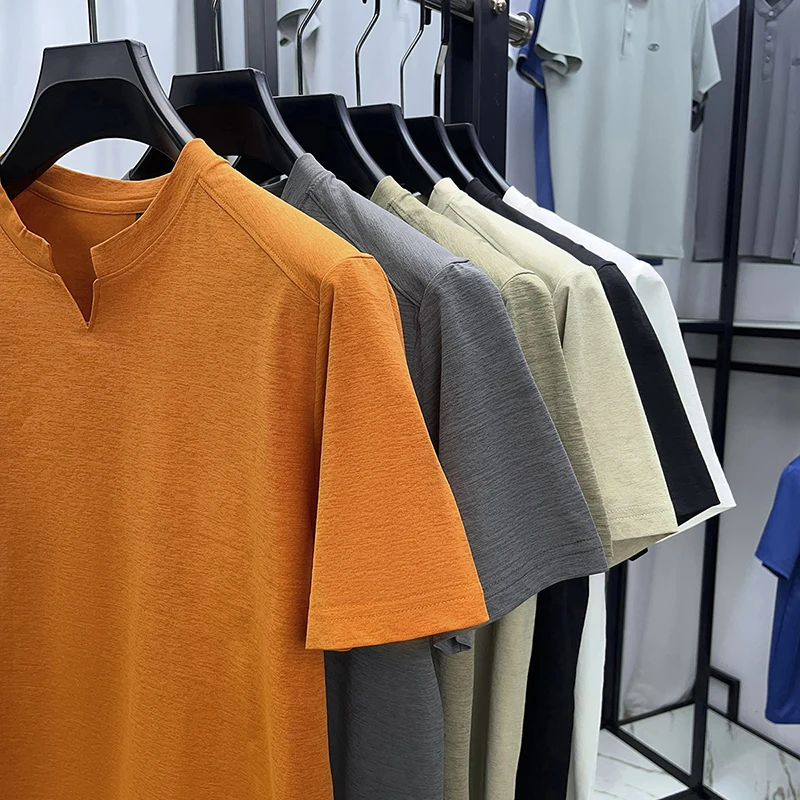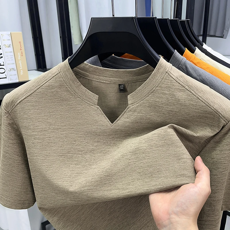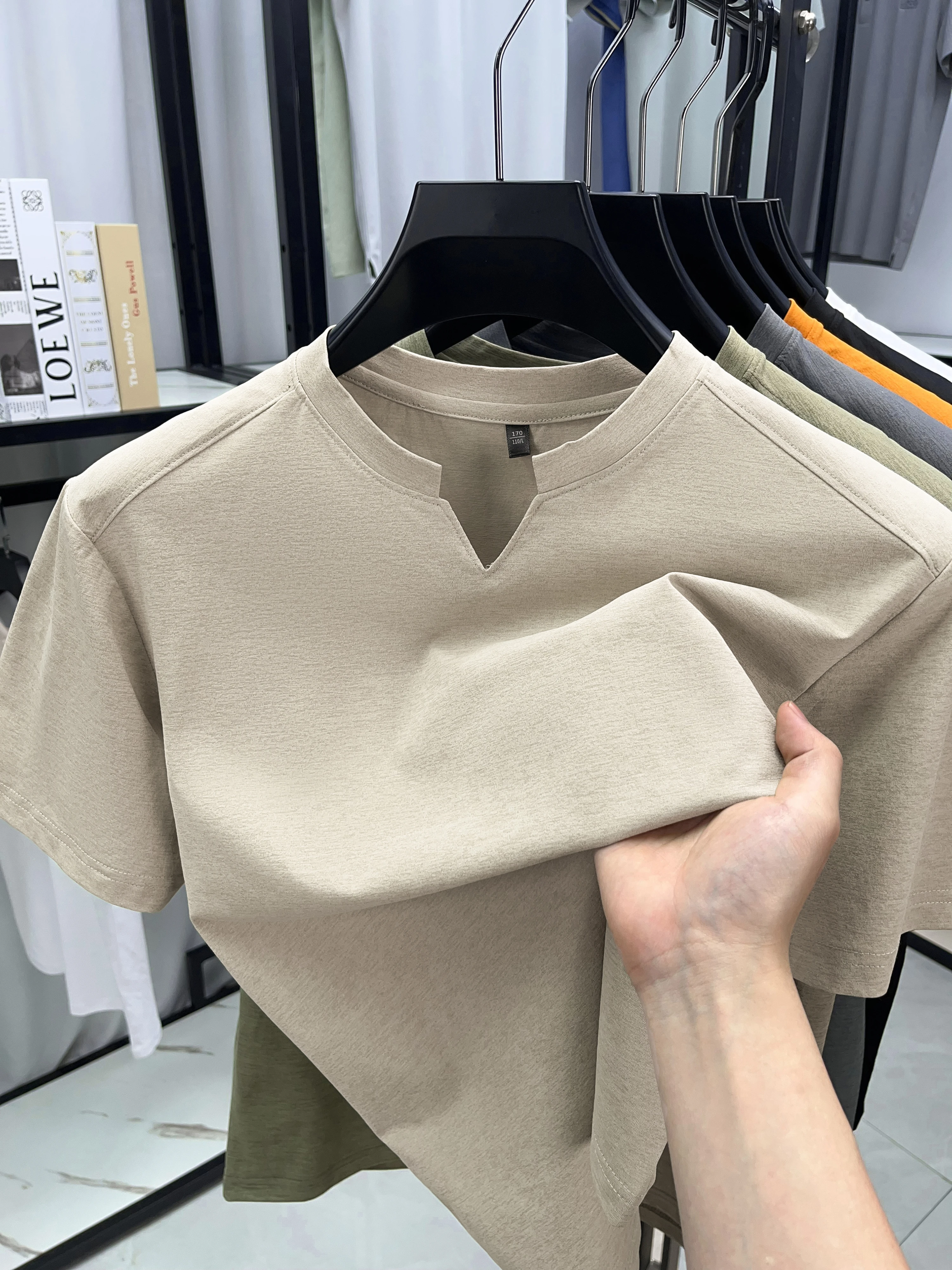 T-shirt estiva a maniche corte con scollo a V da uomo sottile colore puro casual da uomo d’affari comoda traspirante e versatile