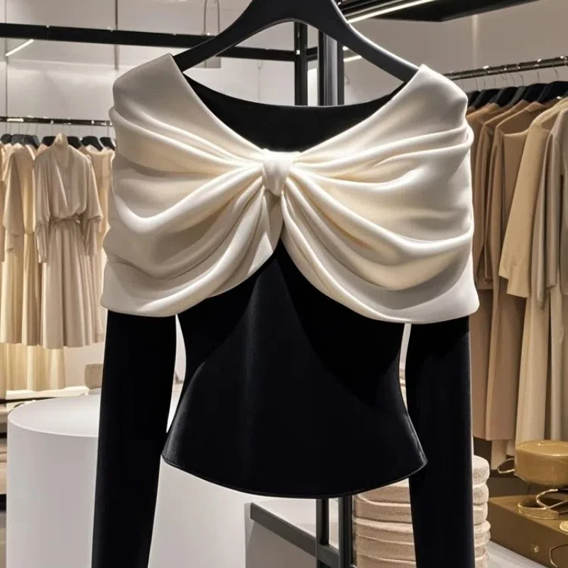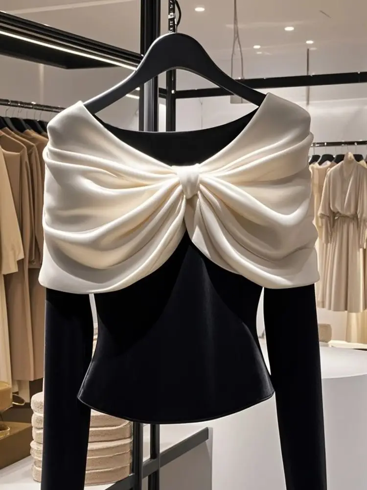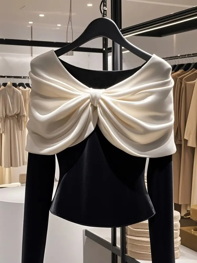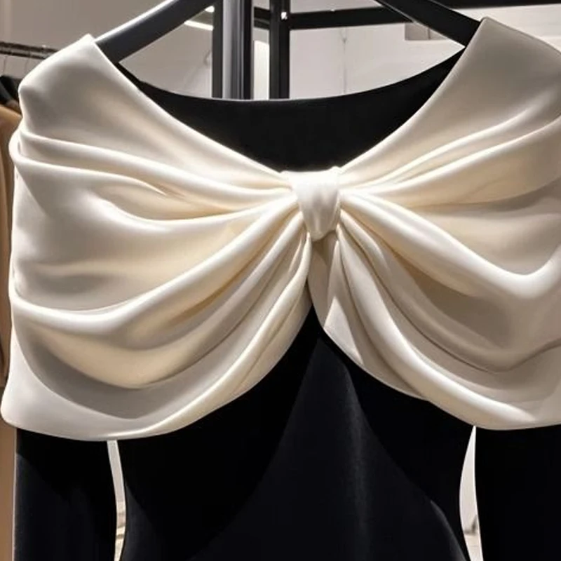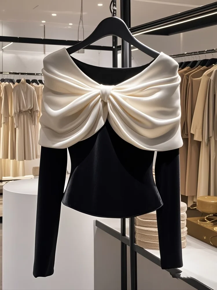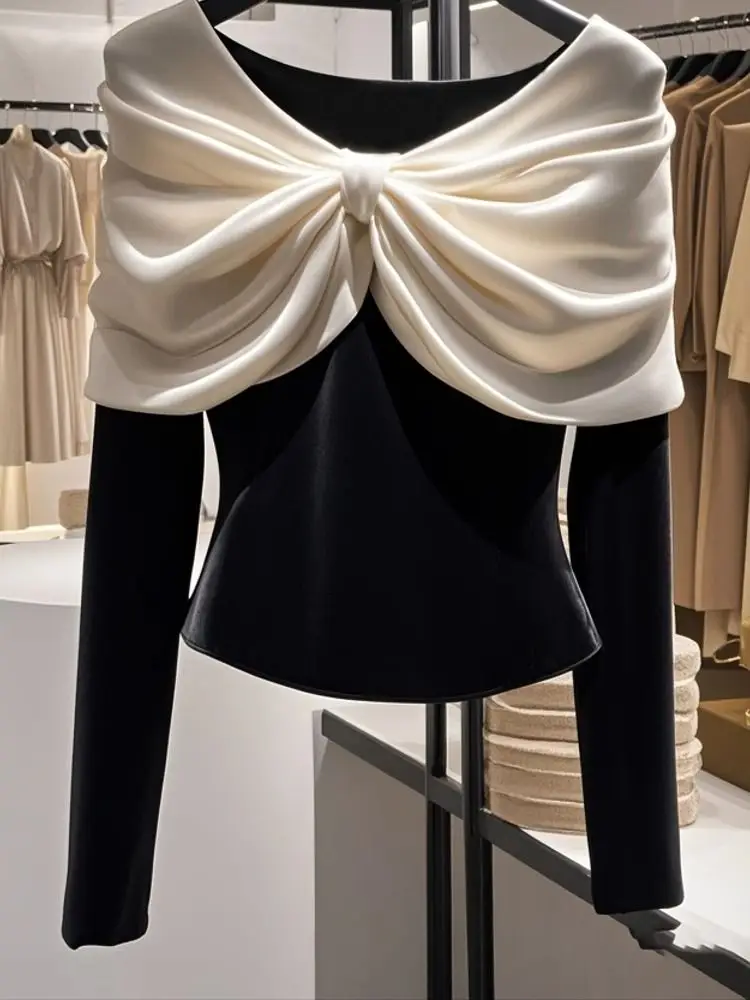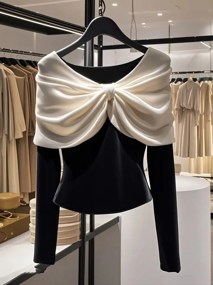 T-shirt moda manica lunga girocollo primavera autunno T-shirt donna High Street Bow Patchwork Pullover Top eleganti vintage all-match