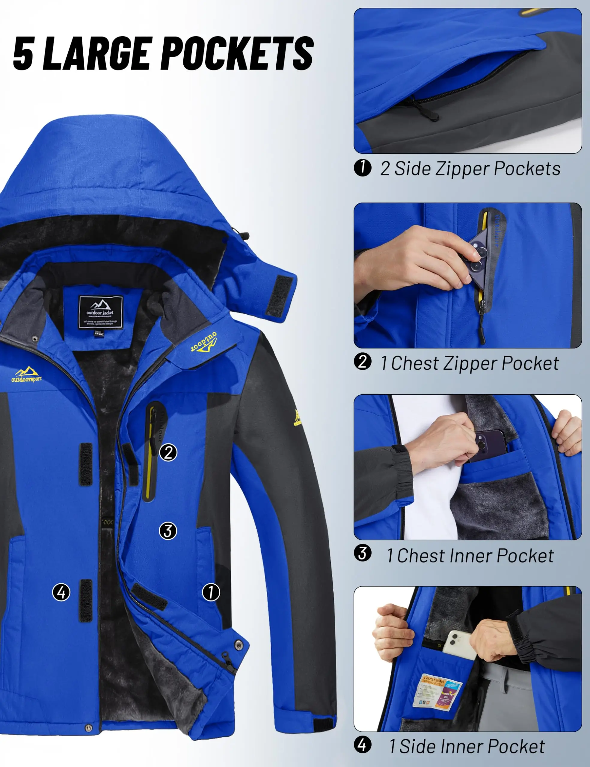 *Materiale di alta qualità: poliestere *Tessuto resistente all’acqua, ottimo per lo snowboard invernale *Cerniera completa, giacca antivento contro forti venti * Fodera in pile addensato, cappuccio incluso, più termico in inverno *Felpa con cappuccio rimovibile con coulisse regolabile *Tasche multi-cerniera: una tasca sul petto con cerniera, 2 tasche laterali con cerniera, una tasca interna *Polsini elastici con gancio e anello per tenere fuori vento e neve. * Adatto per la pesca, l’escursionismo in montagna, lo sci, lo snowboard, l’arrampicata, il campeggio o altre attività all’aperto * Realizzato dalla nostra fabbrica, maggiore garanzia di qualità e più conveniente