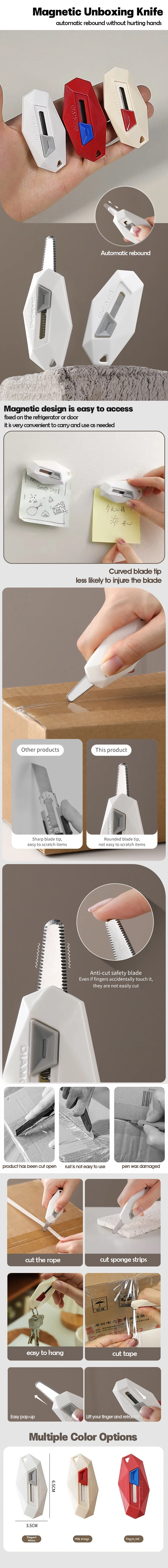 1.Design di rimbalzo: dotato di un design di rimbalzo intelligente, da utilizzare, semplicemente premere la lama delicata.Il momento lancia la tua mano, la lama retratterà automaticamente nel scomparto dei coltelli, elimina completamente il rischio dei coltelli tradizionali che taglia le dita.