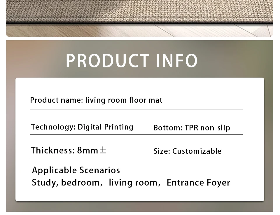 Il tessuto del tappetino è un tessuto in velluto ad anello corto ad alta densità.Il tessuto è resistente all’usura e facile da pulire.Al stesso tempo, ha un leggero effetto di blocco dell’acqua.Il fondo è un fondo antiscivolo TPR.Entrambi i lati anteriori e posteriori hanno un buon effetto antiscivolo.È adatto per il soggiorno., camera da letto, studio e altre scene.