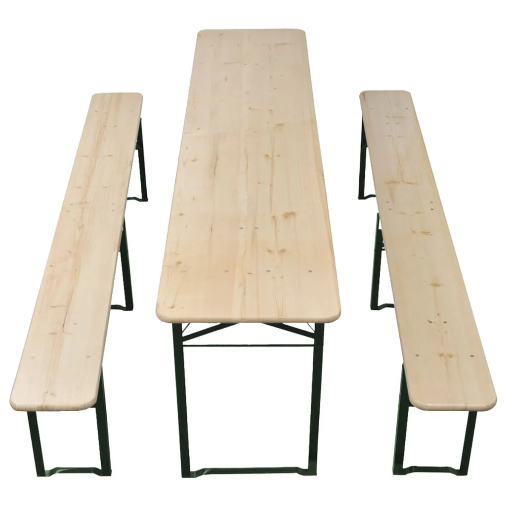 Il tavolo e panche possono essere piegati per risparmiare spazio.Realizzato in legno di abete e metallo, il set è robusto e altamente resistente.