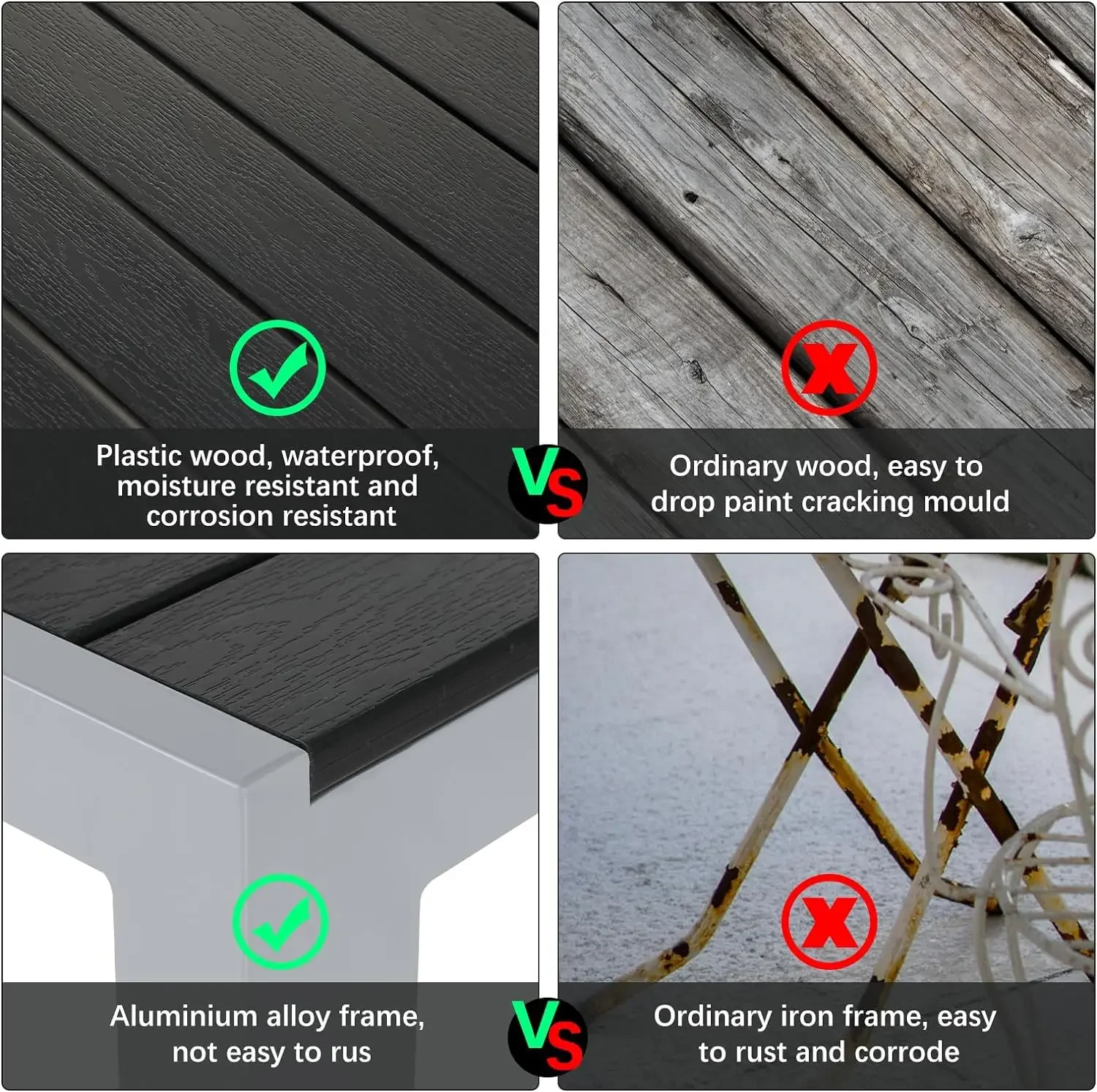 【Legno di plastica a strisce】 Il piano del tavolo è realizzato in legno di plastica, che è impermeabile e resistente all’umidità, resistente alla luce solare e non sbiadisce. È la scelta migliore per i materiali del tavolo da pranzo all’aperto; la superficie del tavolo è progettata con strisce e abbinate al nero, che è classica e alla moda.