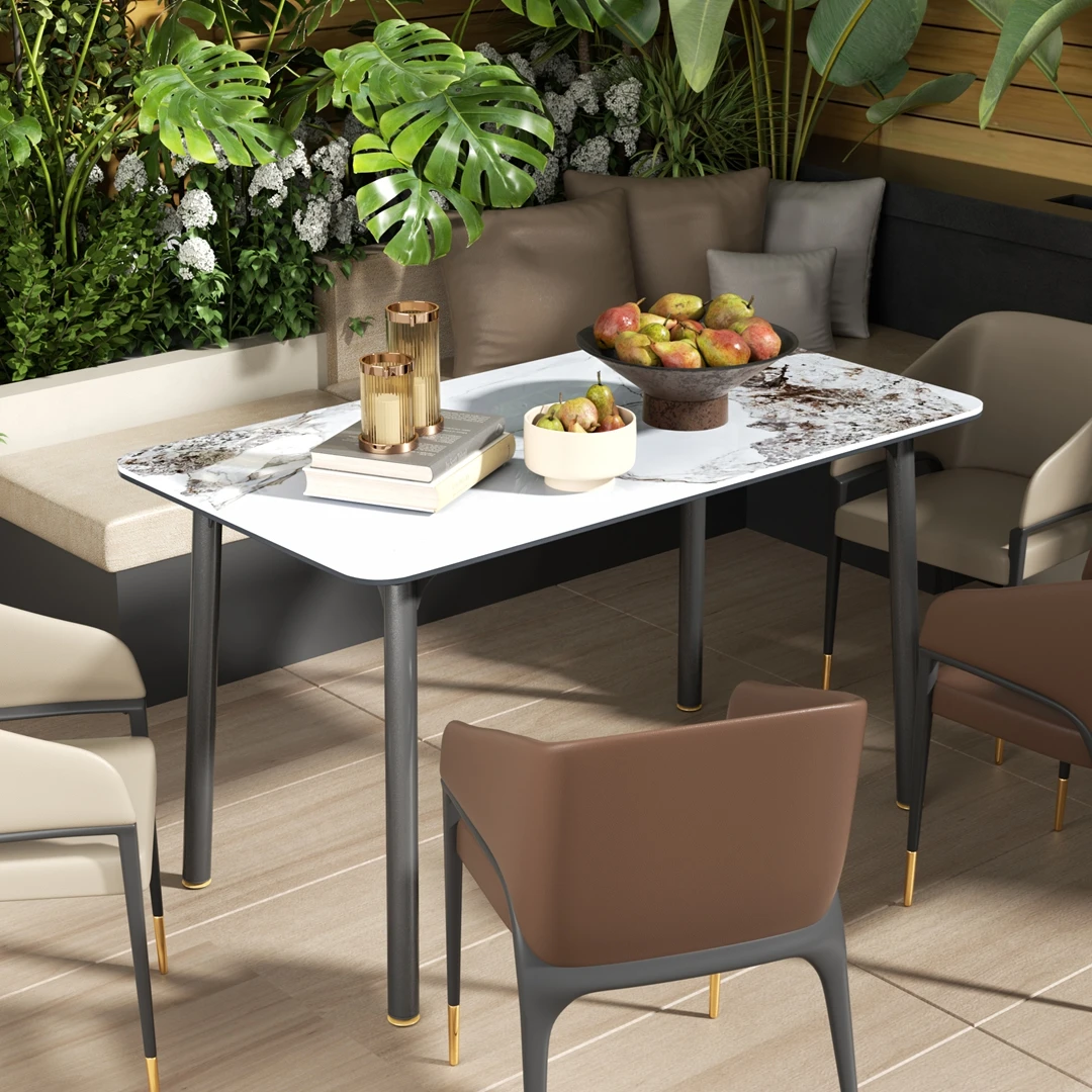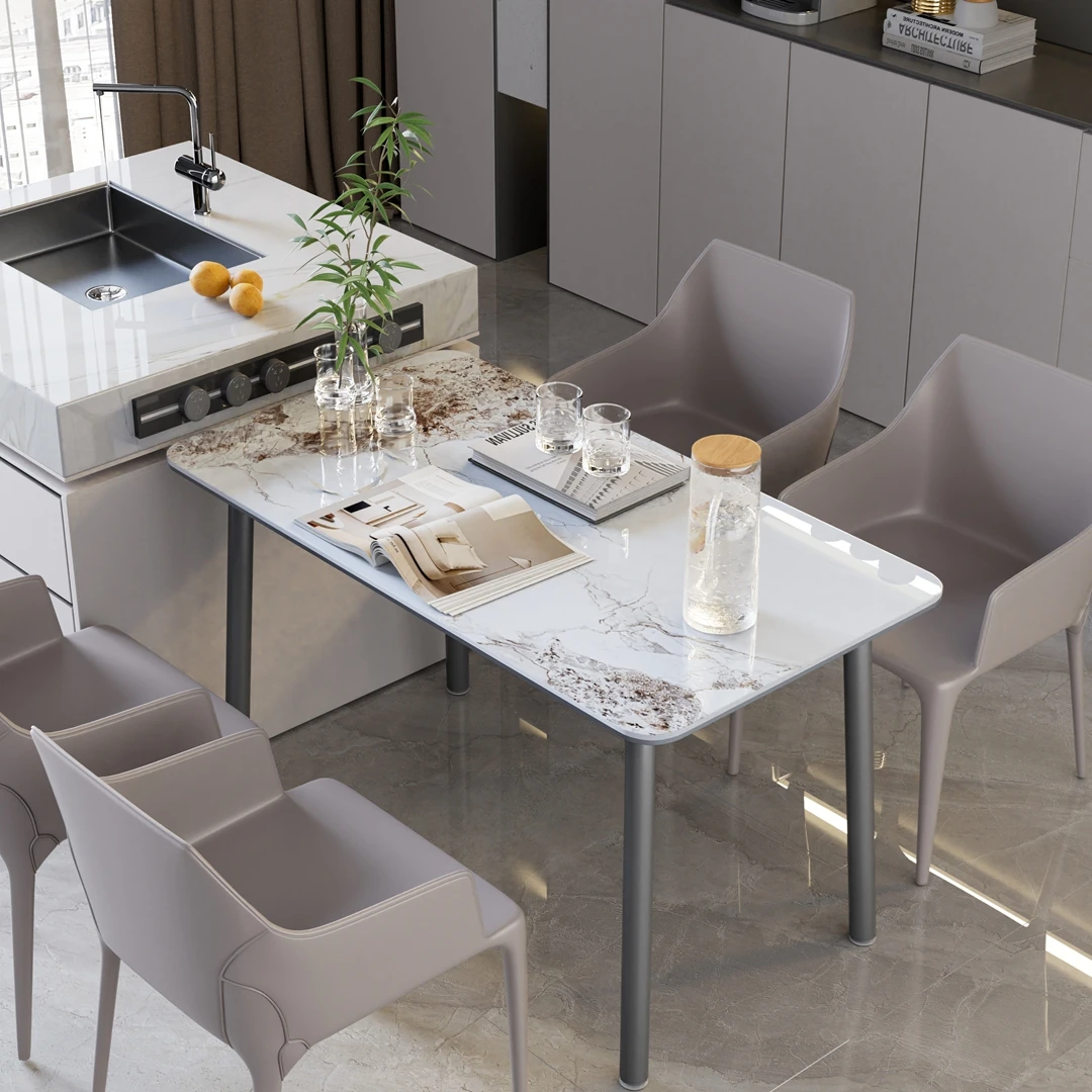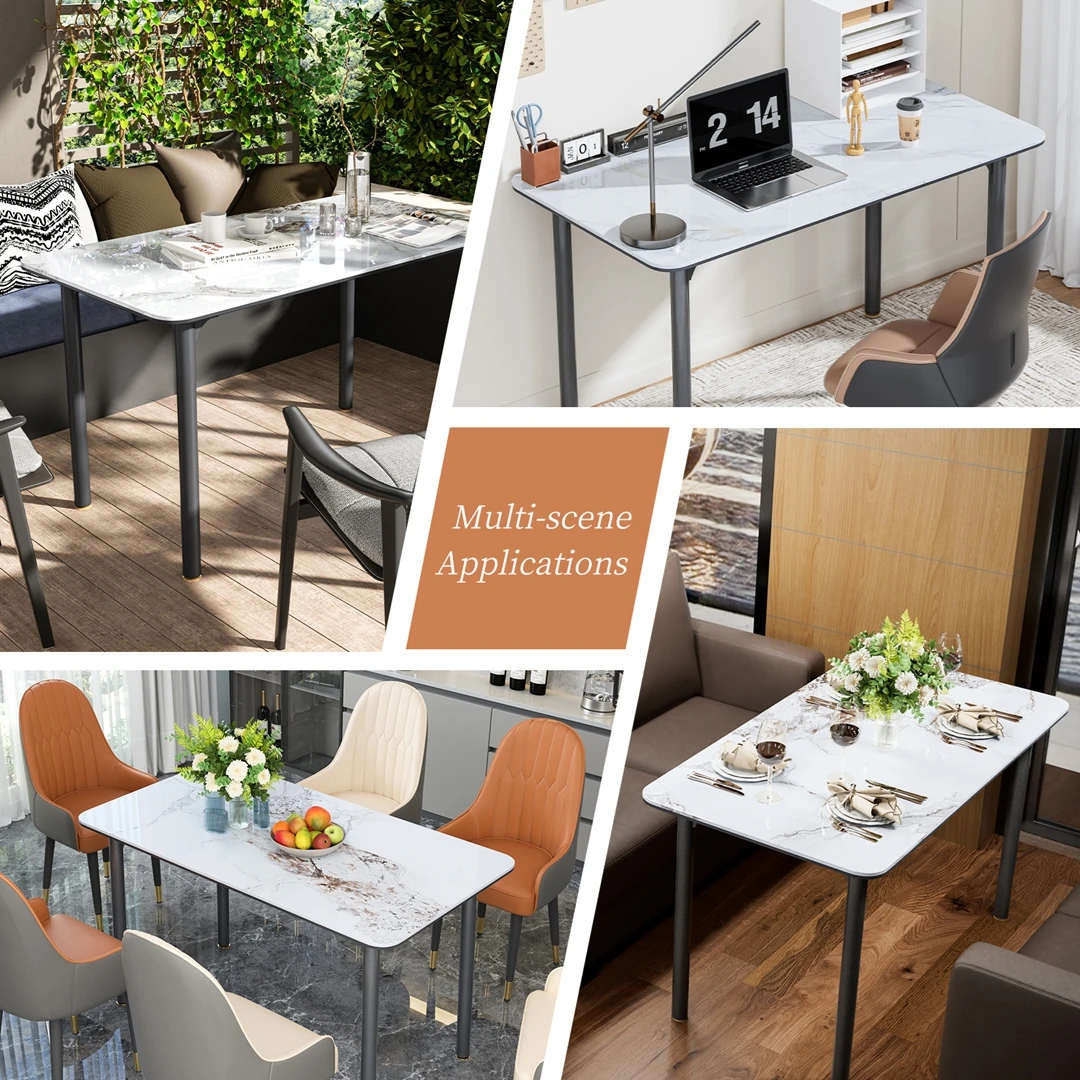Realizzato realizzato in pietra sinterizzata e vetro temperato, questo tavolo da cucina rettangolare garantisce una resistenza duratura all’usura e allo strappo durante mantenere l’integrità strutturale.Le sue linee pulite e un profilo elegante incorporano un’estetica minimalista, si miscelano perfettamente in diversi stili interni.