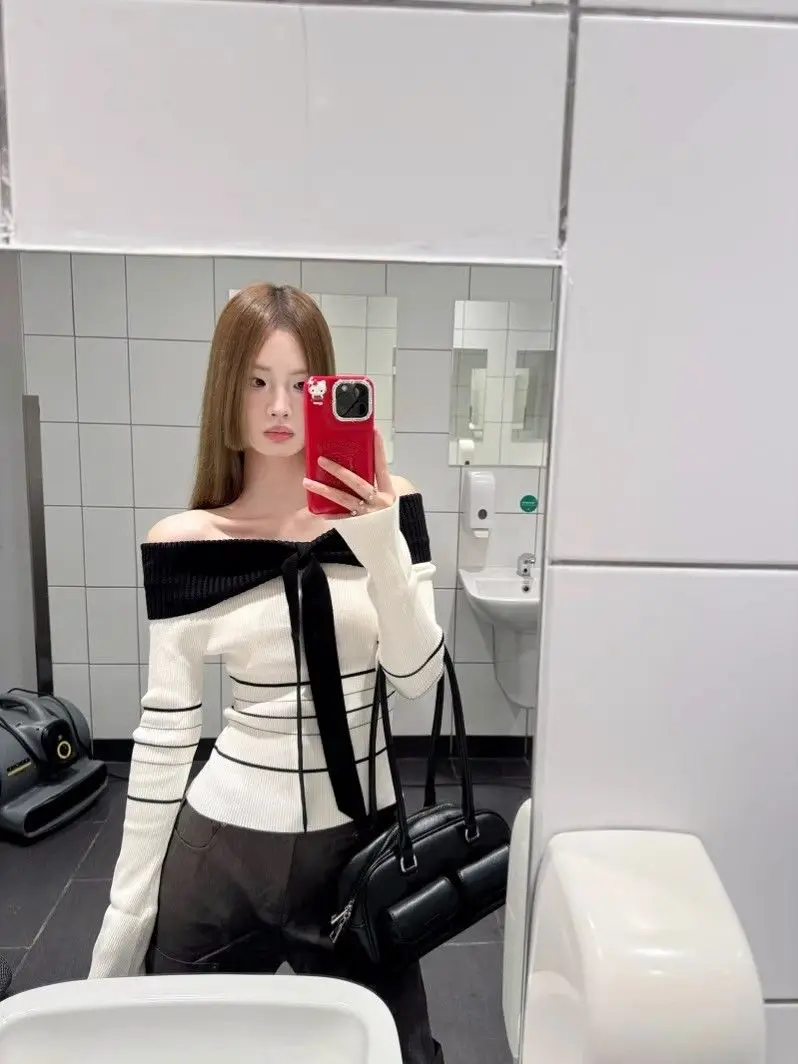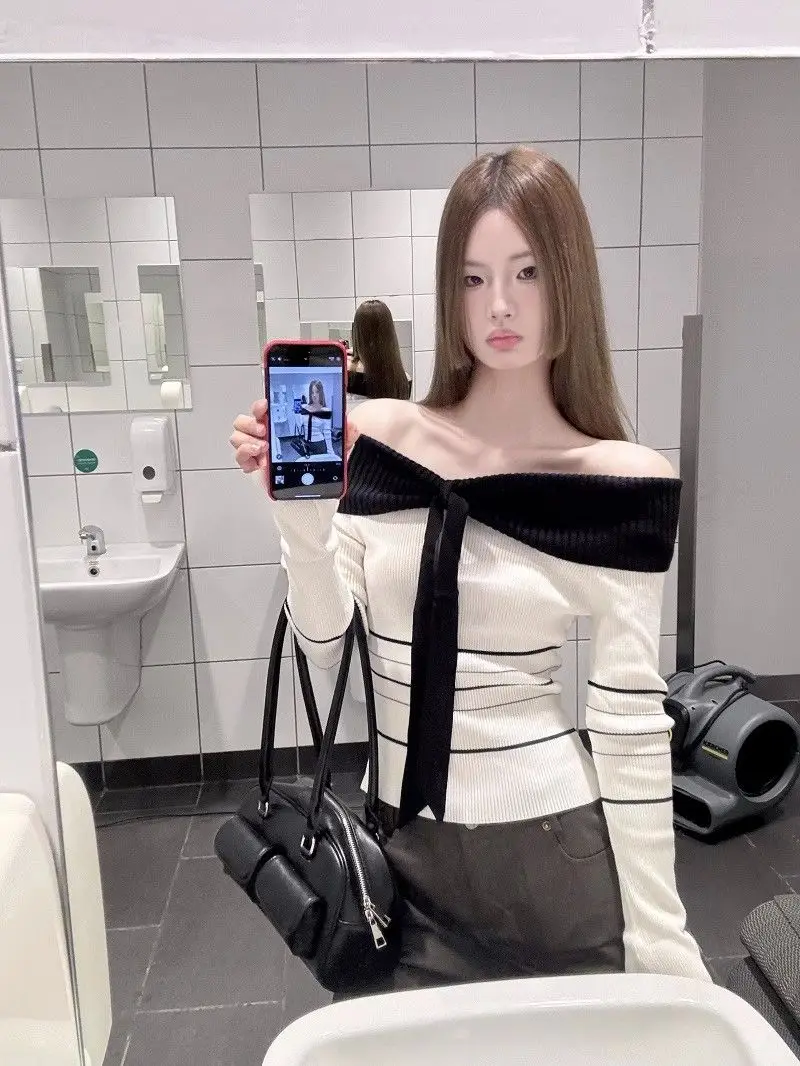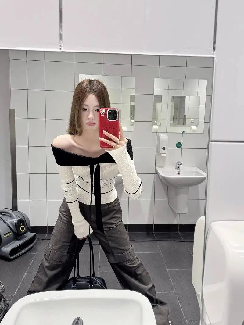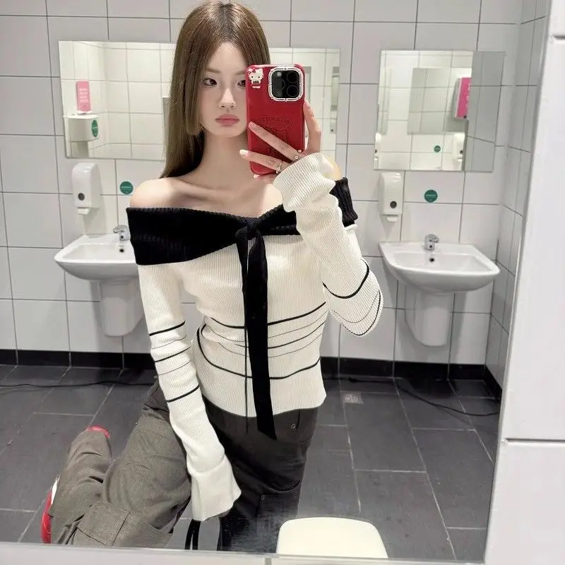 Temperamento a contrasto a righe corto con spalle scoperte Top tendenza autunnale manica lunga maglieria maglione sexy moda Y2K abbigliamento donna