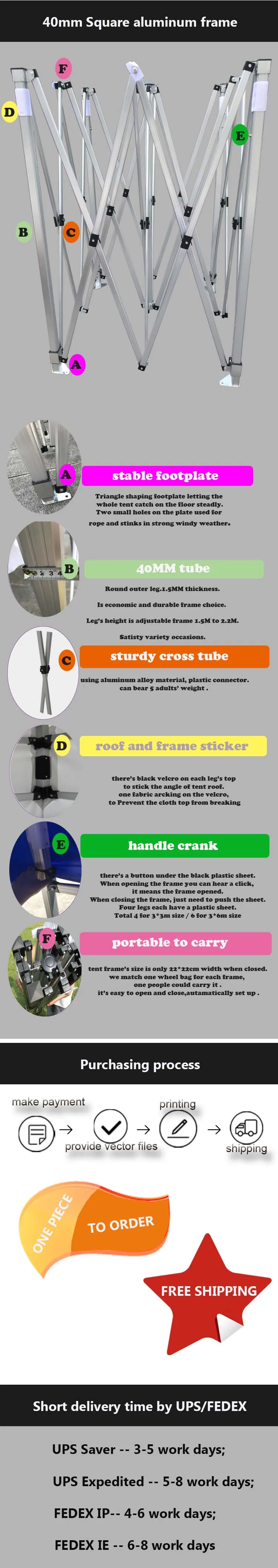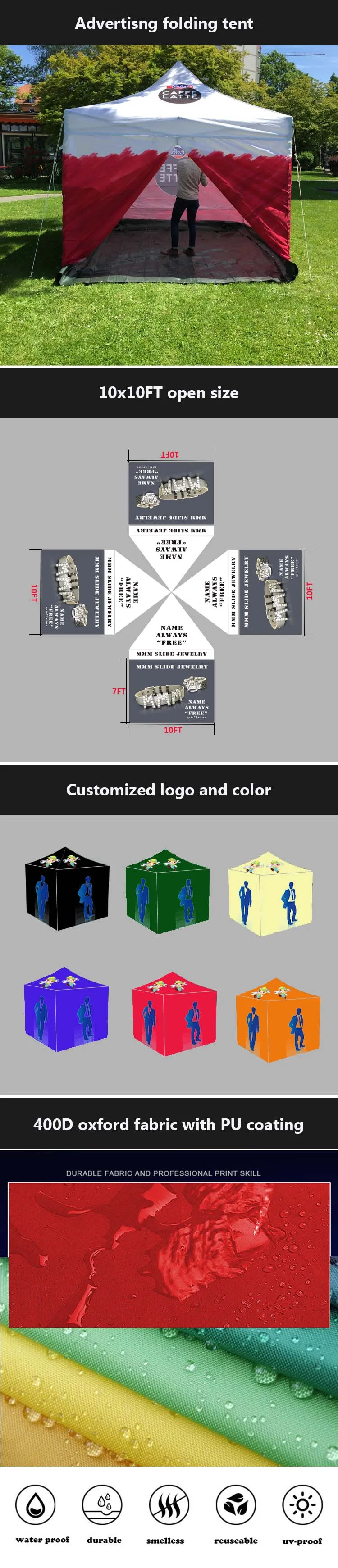 Con un logo vivido e stampa a colori, le nostre tende sono ampiamente per promozioni all’aperto, spettacoli commerciali, mercato notturno, bancarelle di cibo, avventure di campeggio, matrimoni, celebrazioni, feste all’aperto.