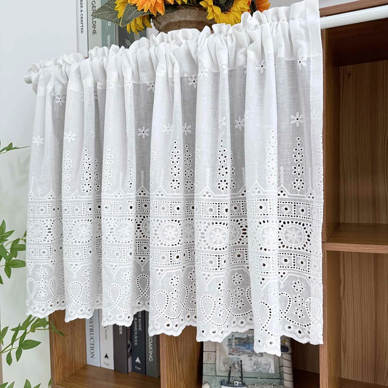 Tenda da caffè europea semplice e squisita con ricamo a fiori scavati Tenda corta in tessuto bianco elegante per armadio da cucina